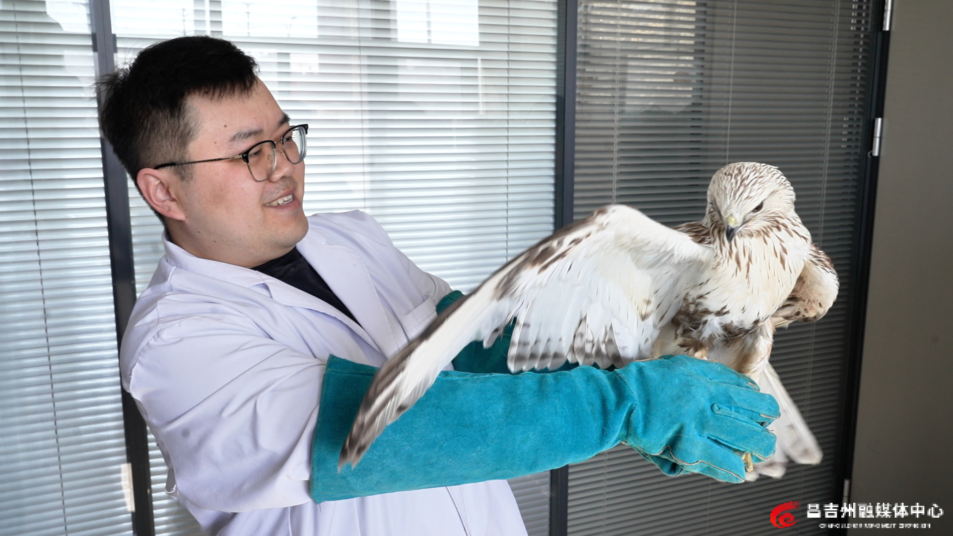 动物医生正在查看前几日救治的国家二级保护野生动物毛脚鵟的恢复情况。记者常建洋 摄