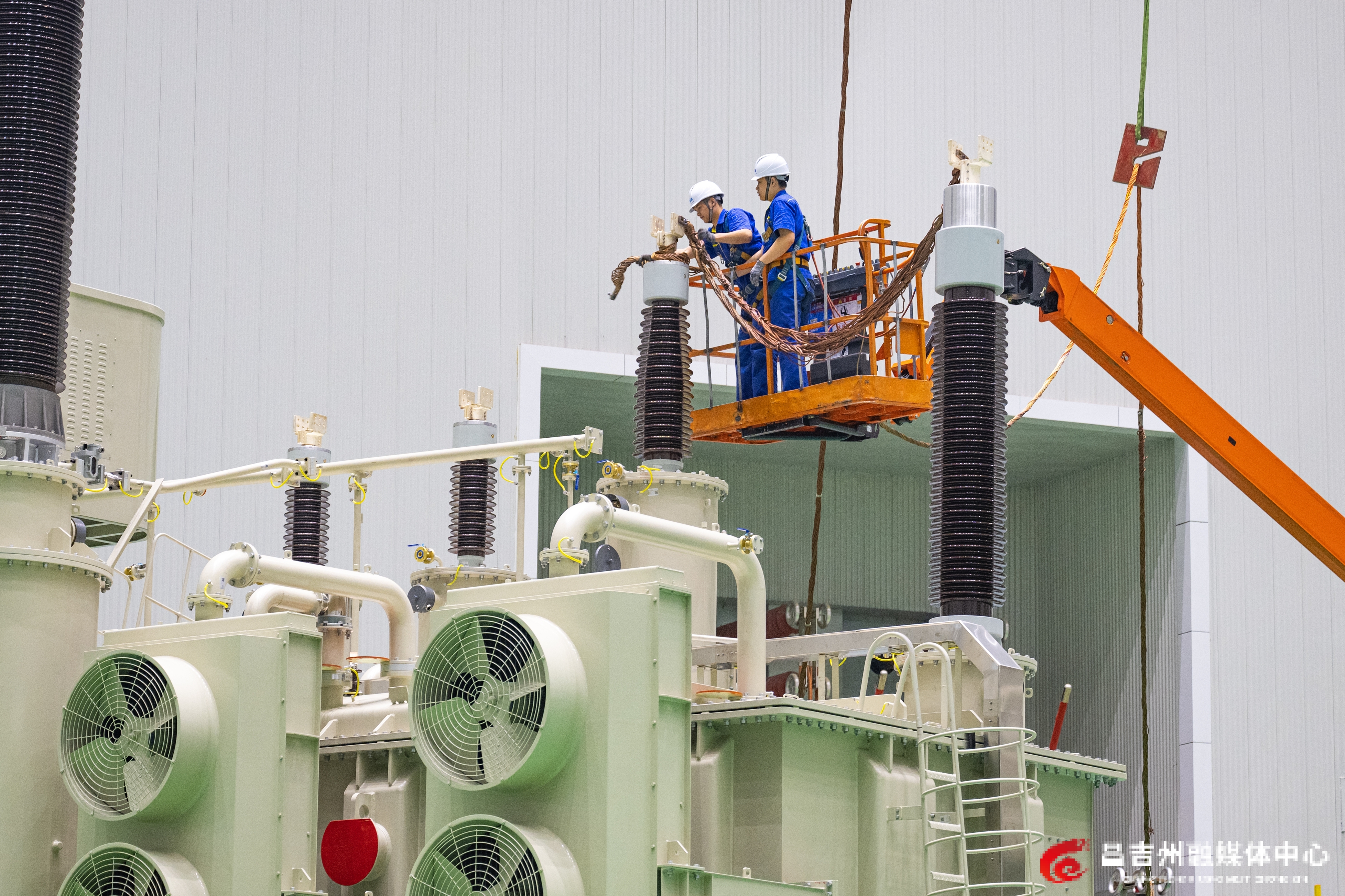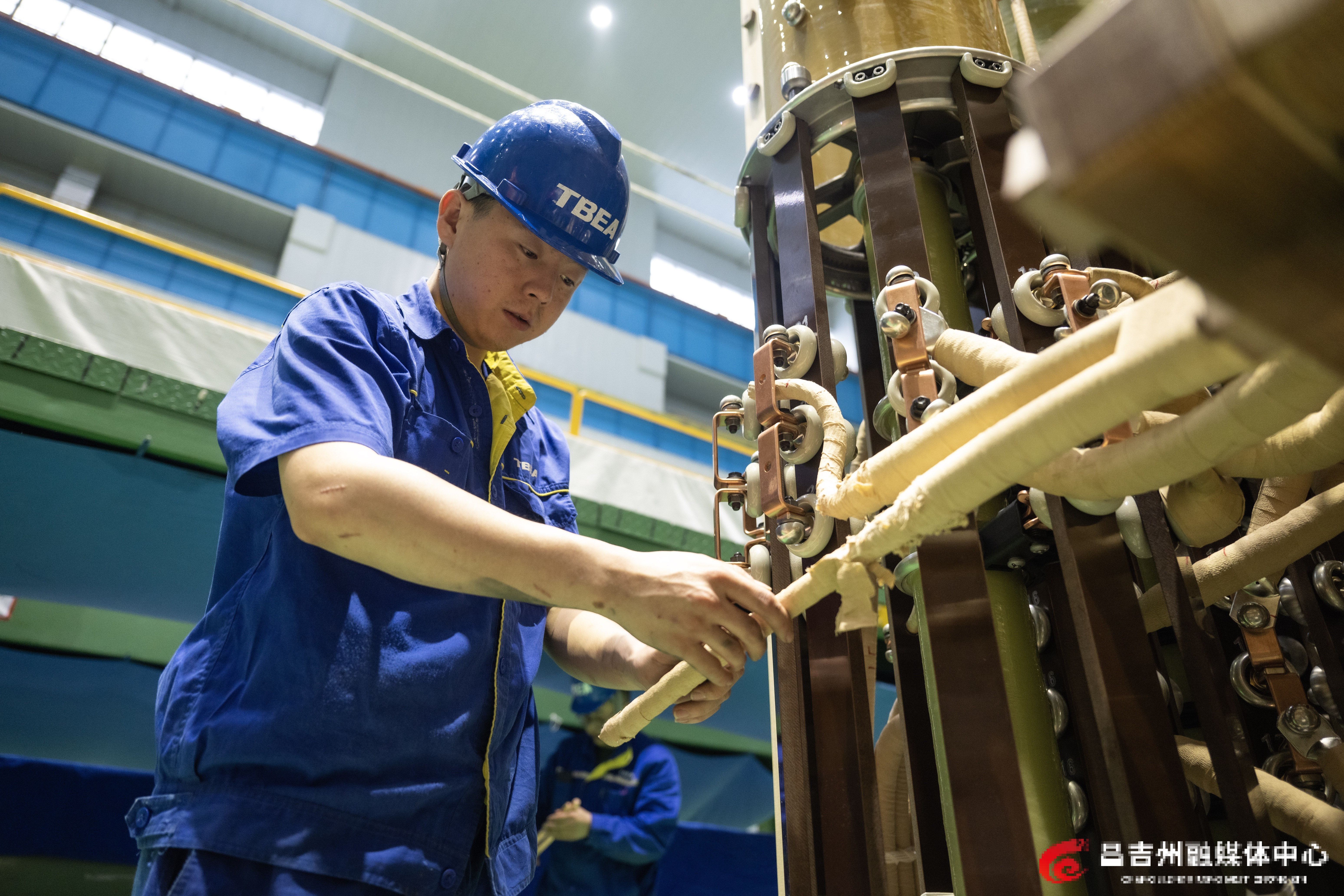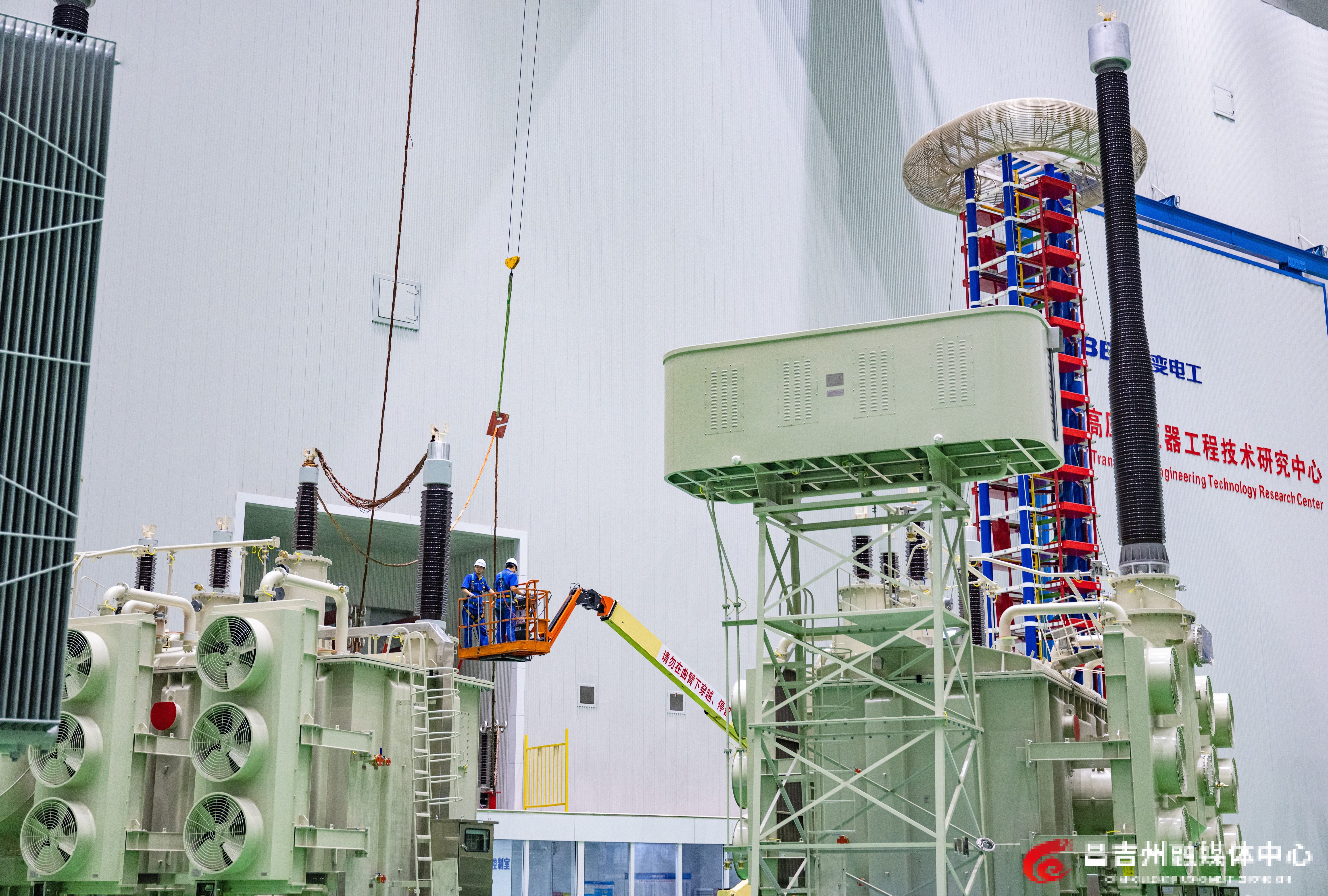 3月31日,在昌吉市特变电工新疆输变电科技产业园国家特高压变压器工程技术研究中心,研发人员在对生产组装完成的变压器开展试验前准备工作。