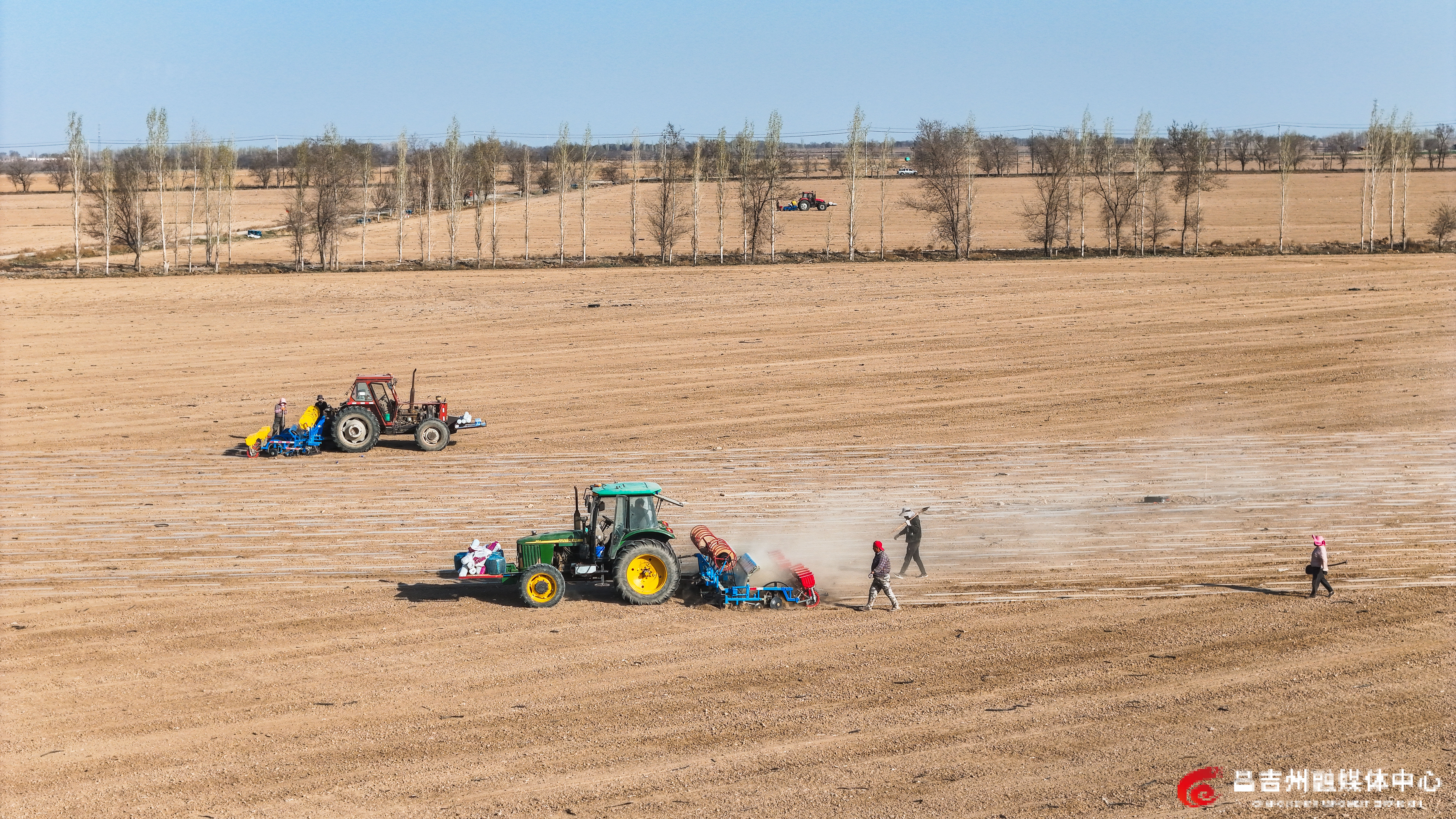 4月6日,在呼图壁县五工台镇龙王庙村,农机手驾驶搭载北斗导航系统的精量播种机开展棉花播种作业。