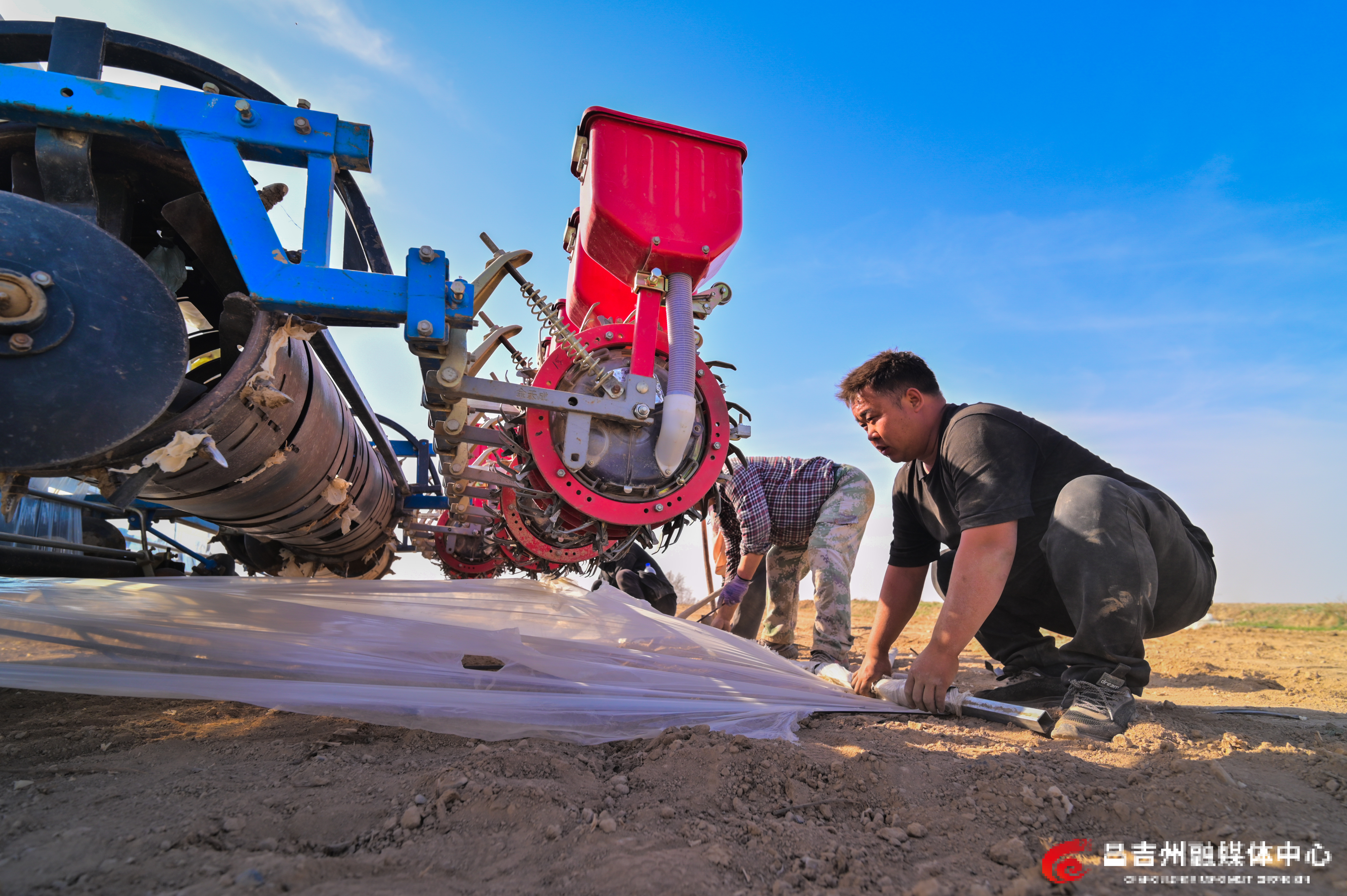 4月6日,在呼图壁县五工台镇龙王庙村,农民正在播种棉花。
