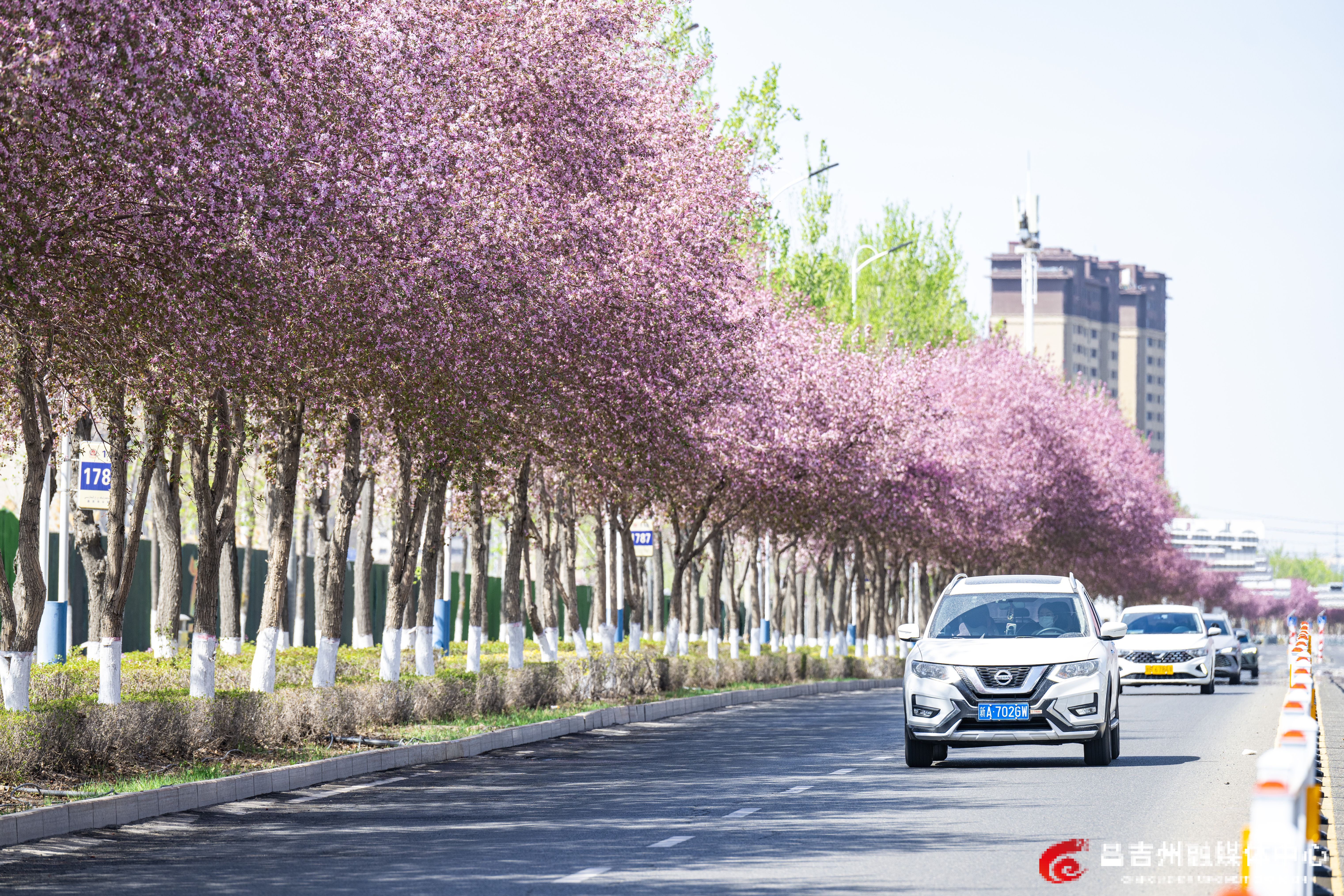 4月15日,昌吉市石河子西路道路两旁的红叶海棠盛开,扮靓城市。