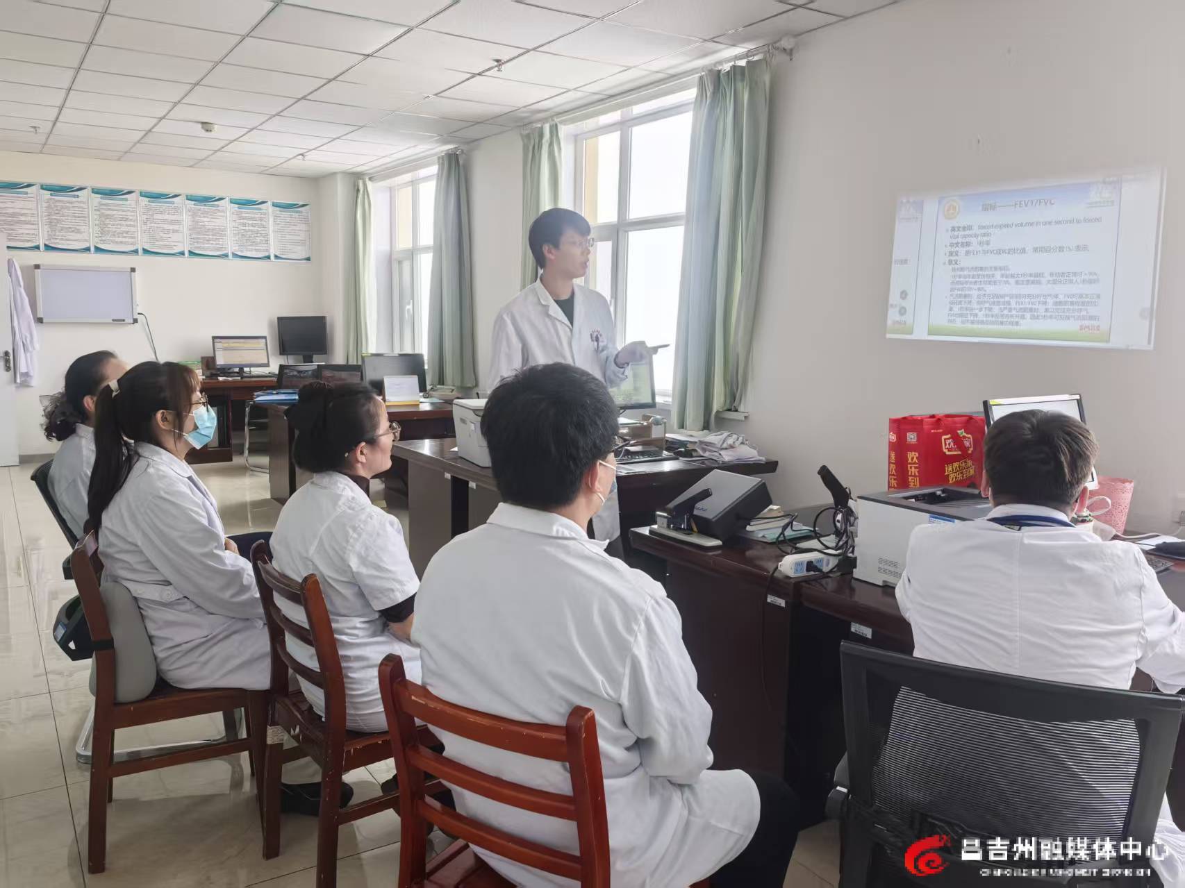 林振元(图中站立者)为科室医生培训相关业务。图片由受访者提供