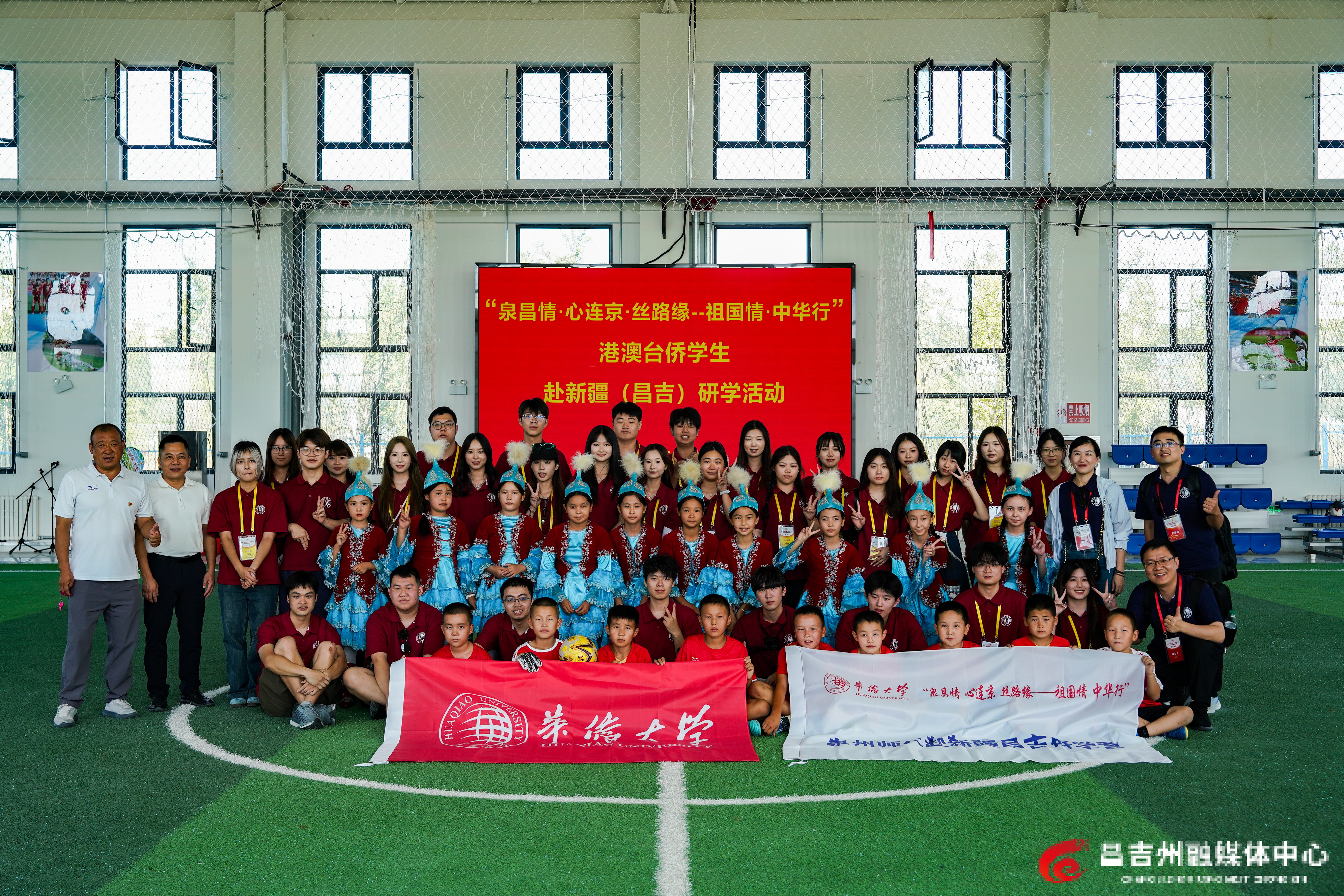 8月9日,参加“泉昌情·心连京·丝路缘——祖国情·中华行”赴新疆(昌吉)研学活动的华侨大学师生走进昌吉市阿什里乡中心学校与该校中小学生合影留念。记者常谊谊 摄