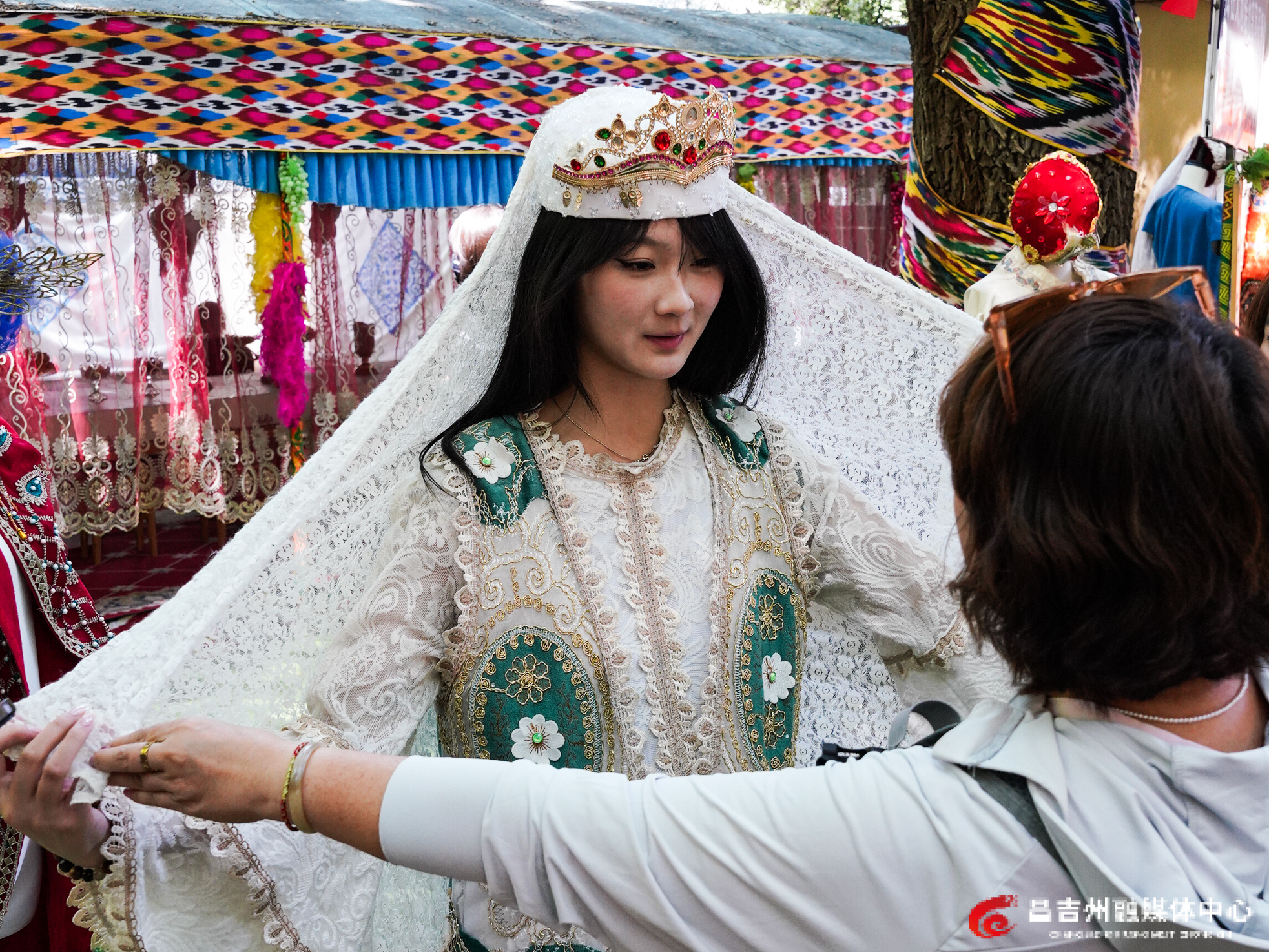 8月8日,参加“泉昌情·心连京·丝路缘——祖国情·中华行”赴新疆(昌吉)研学活动的华侨大学学子在天山天池景区的哈萨克民俗风情园体验民族传统服饰。 记者常谊谊 摄