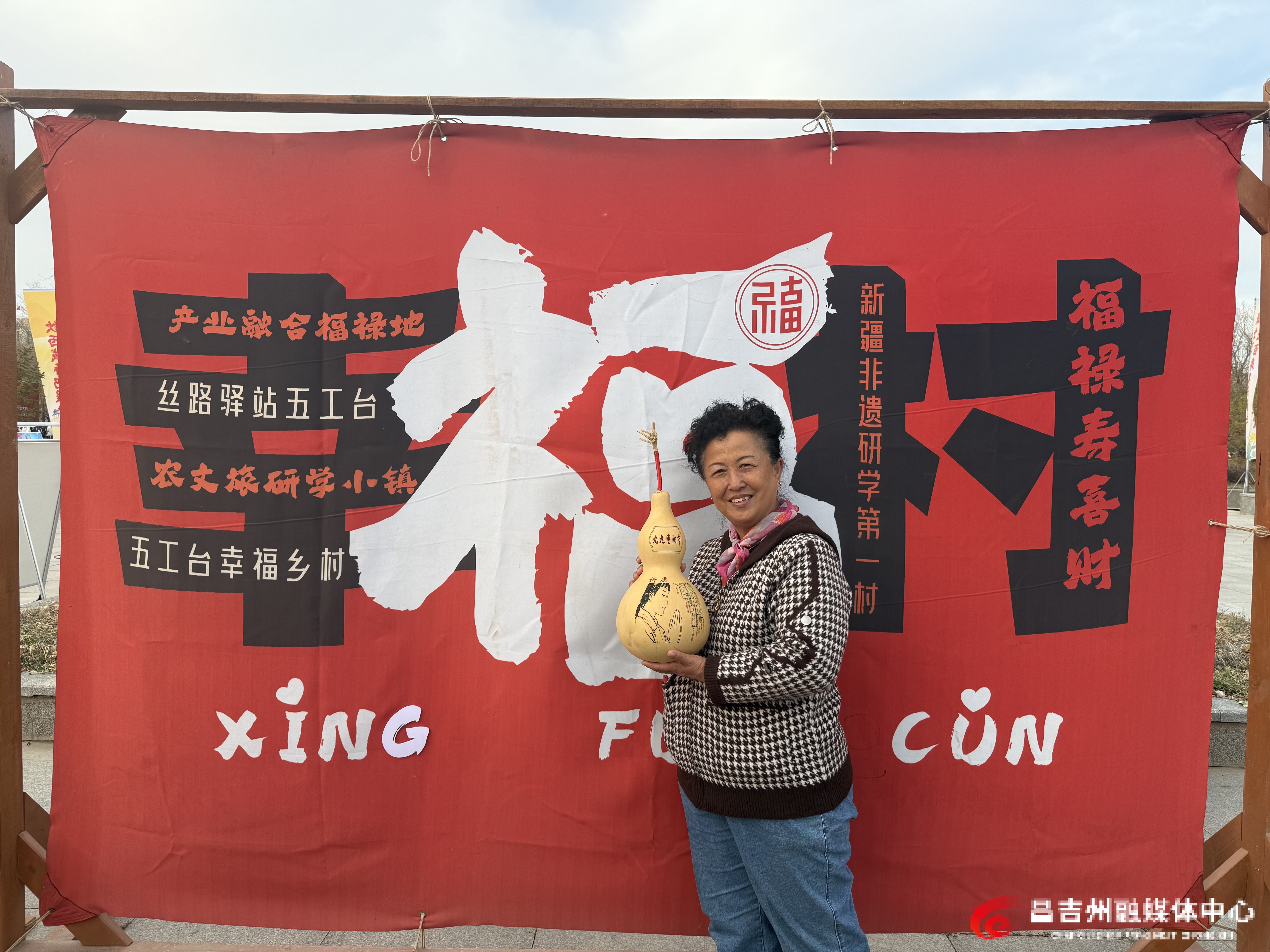 10月29日,在康养文创展示区,呼图壁县居民拍照留念。实习记者杨晓溢 摄