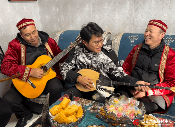 在天鹅小镇居民家中,台湾青年在达尔汗文艺宣讲队的指导下试弹冬不拉。记者田春雨 摄