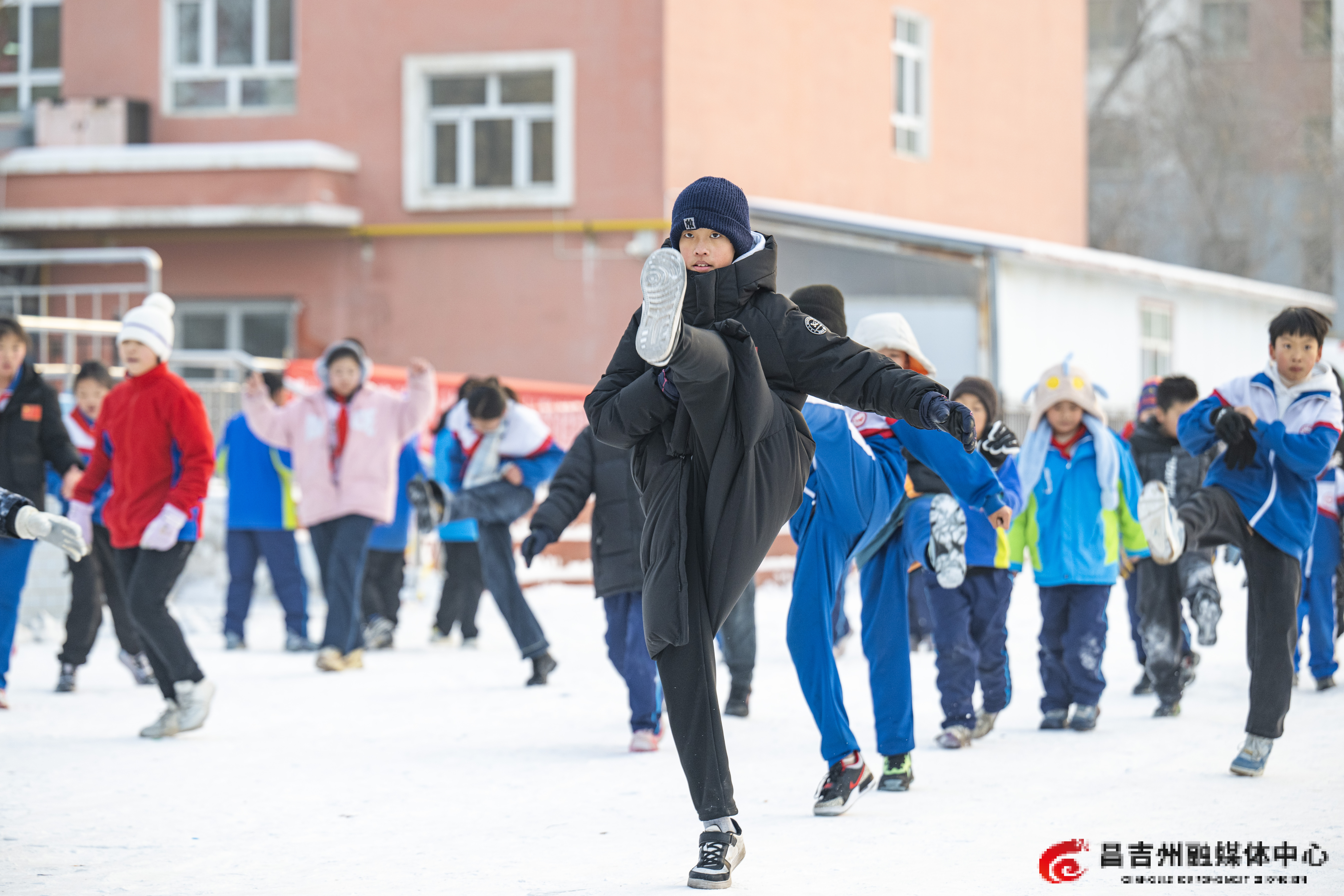 1月8日,昌吉市第七小学,同学们在操场进行热身运动。