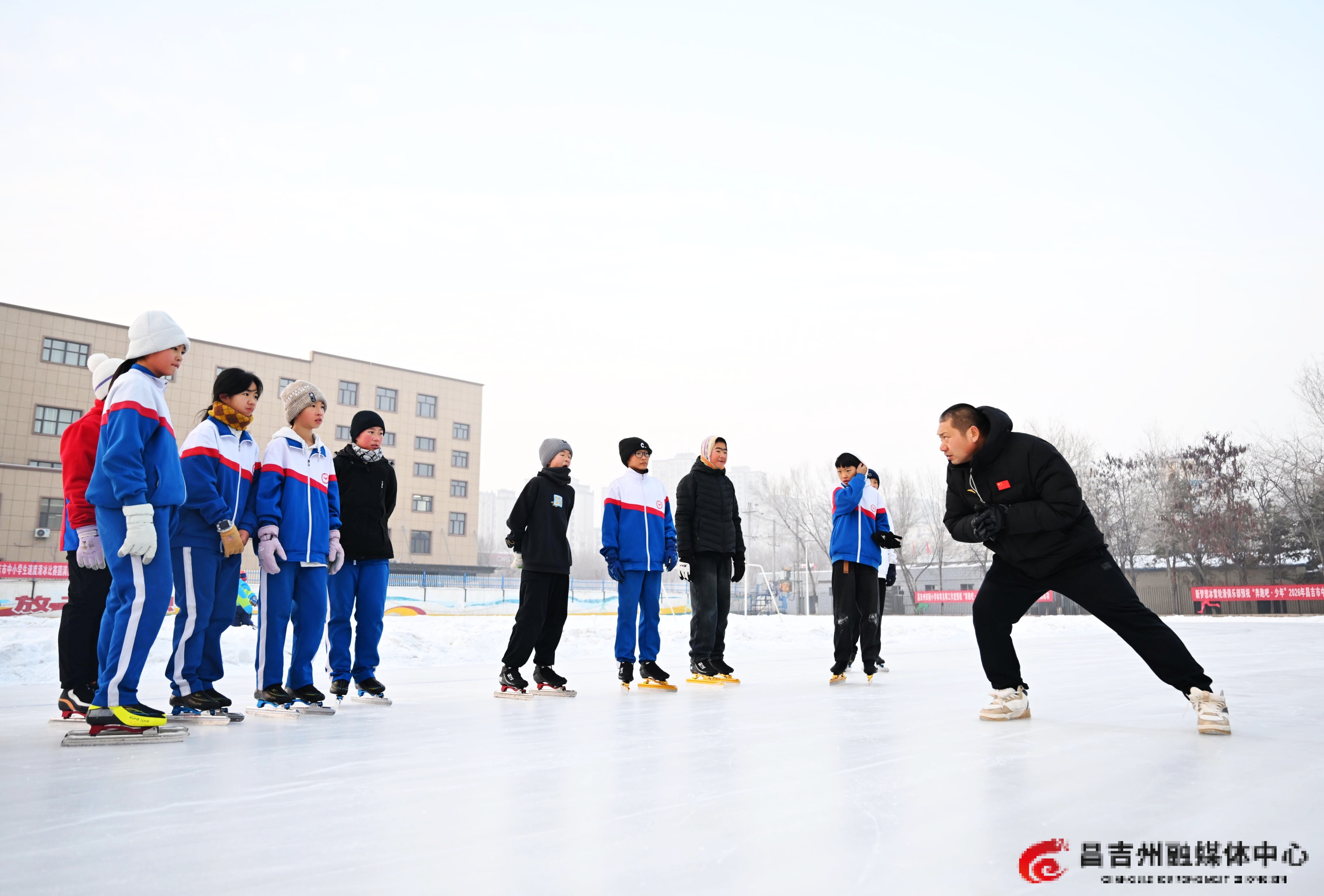 1月8日,昌吉市第七小学,老师在给同学们传授滑冰动作要领。