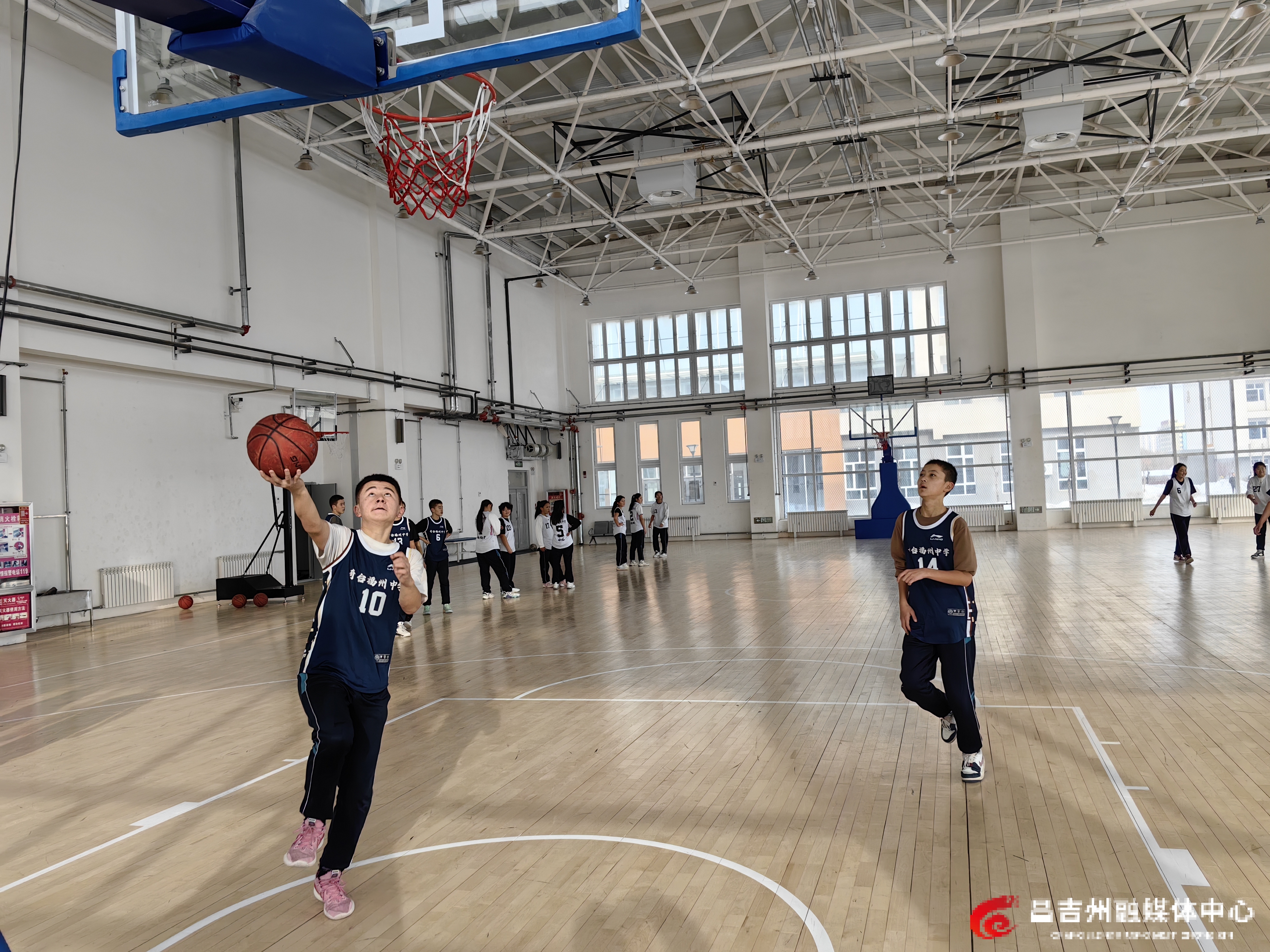 1月16日,在奇台县奇台福州中学篮球馆内,学生正在上篮球课。