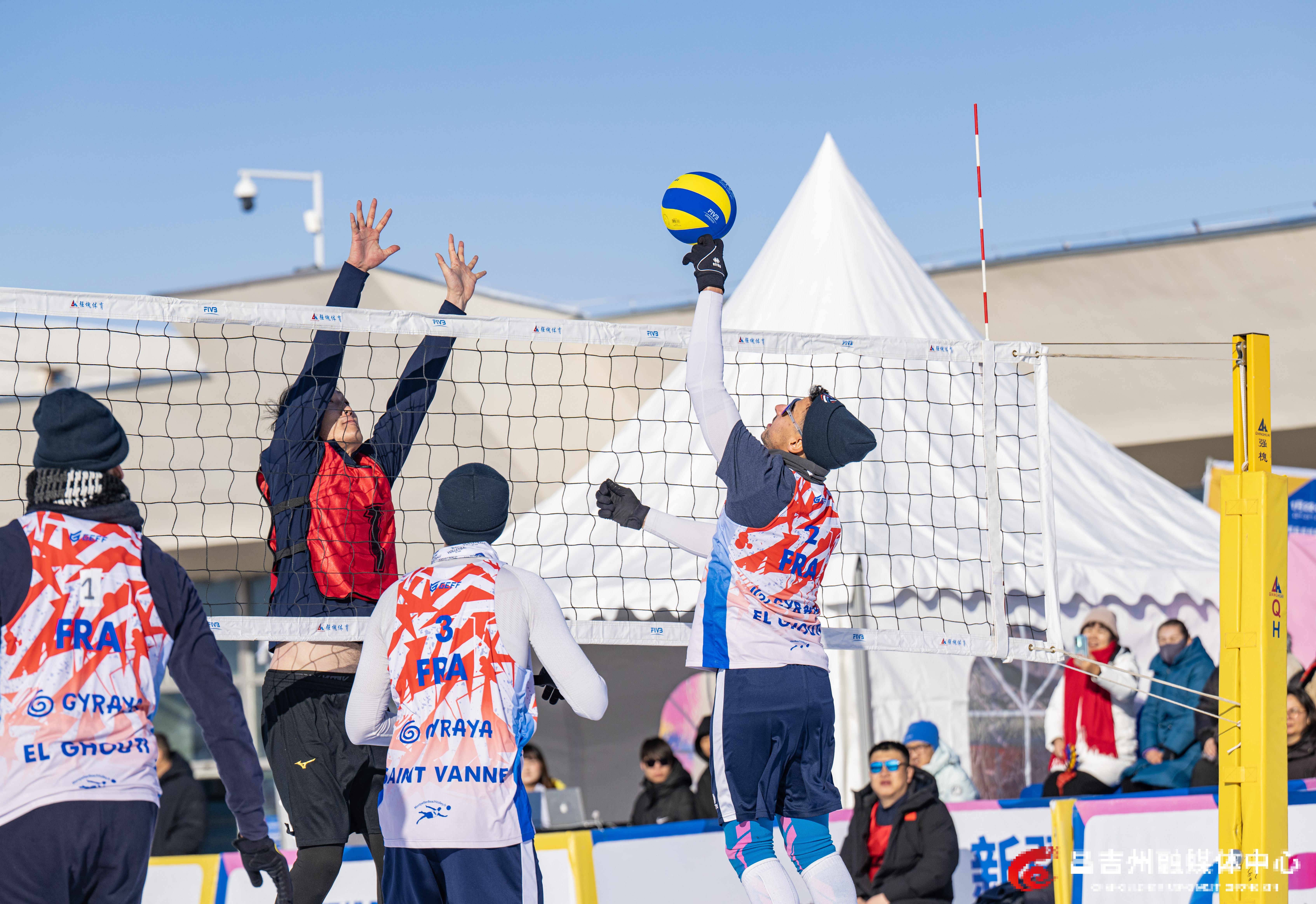 1月22日,阜康市天山天池国际滑雪场,“一带一路·丝绸之路”行2026年中国国际雪地排球邀请赛比赛现场,中国内蒙古队和法国队比赛现场。