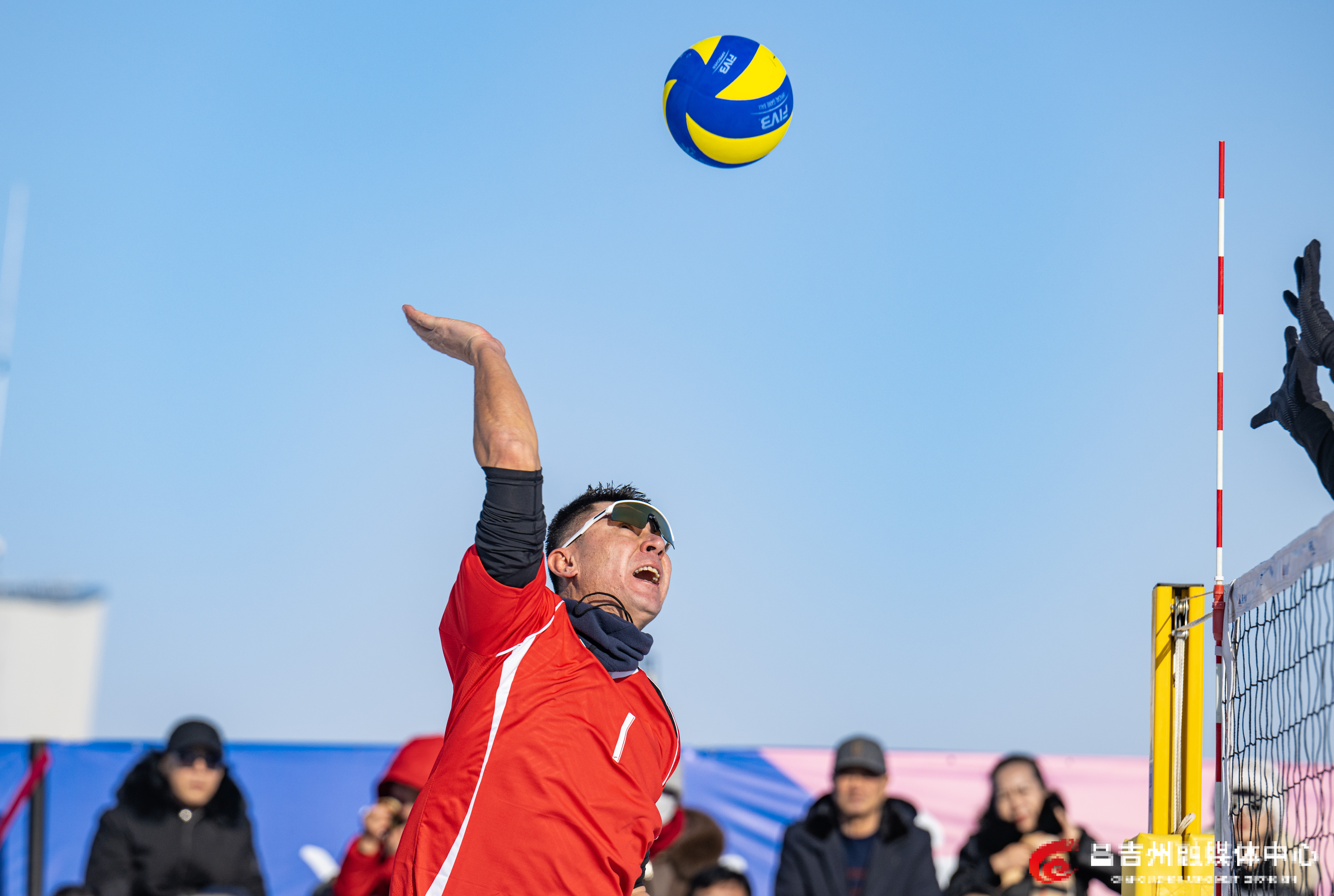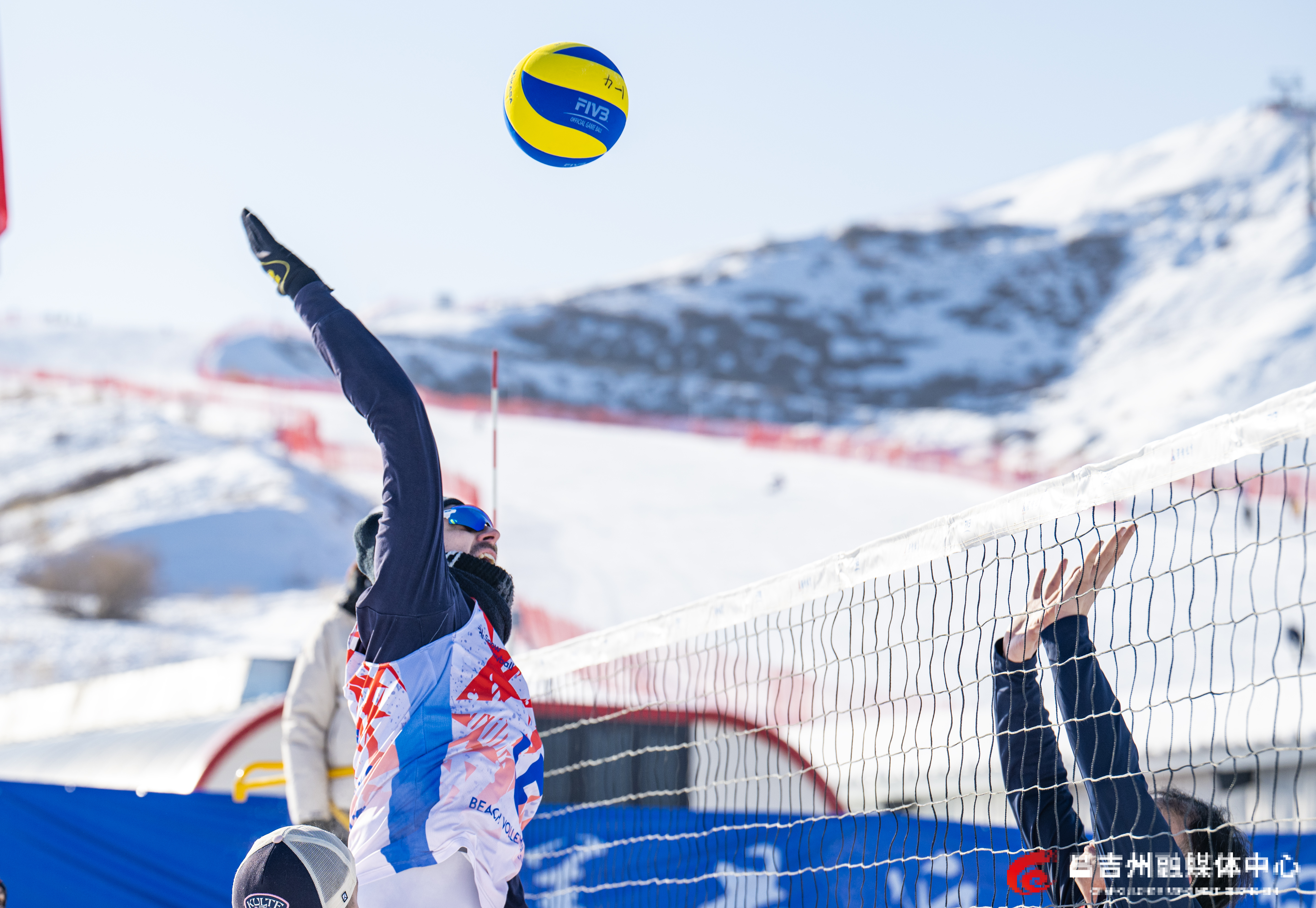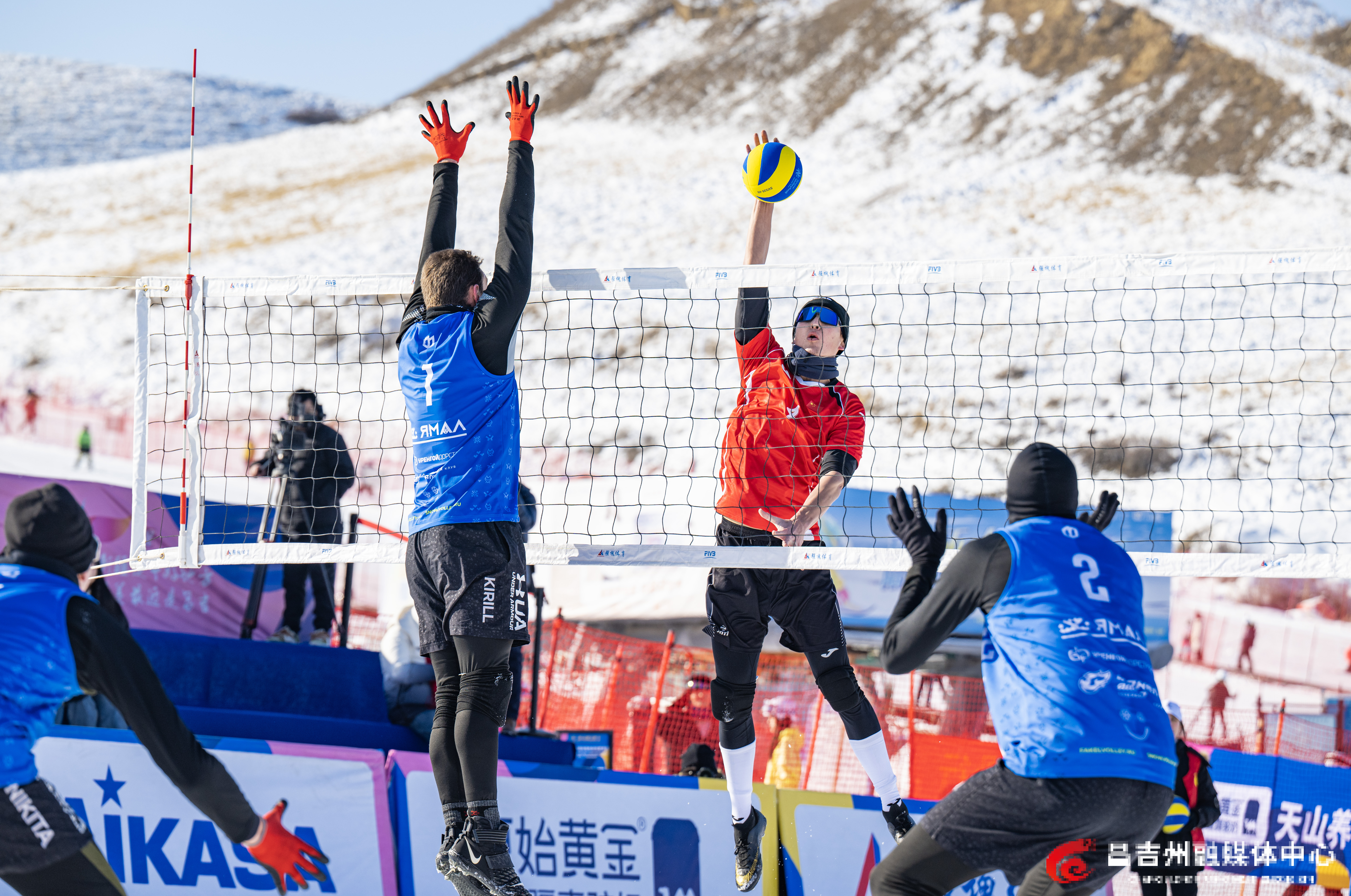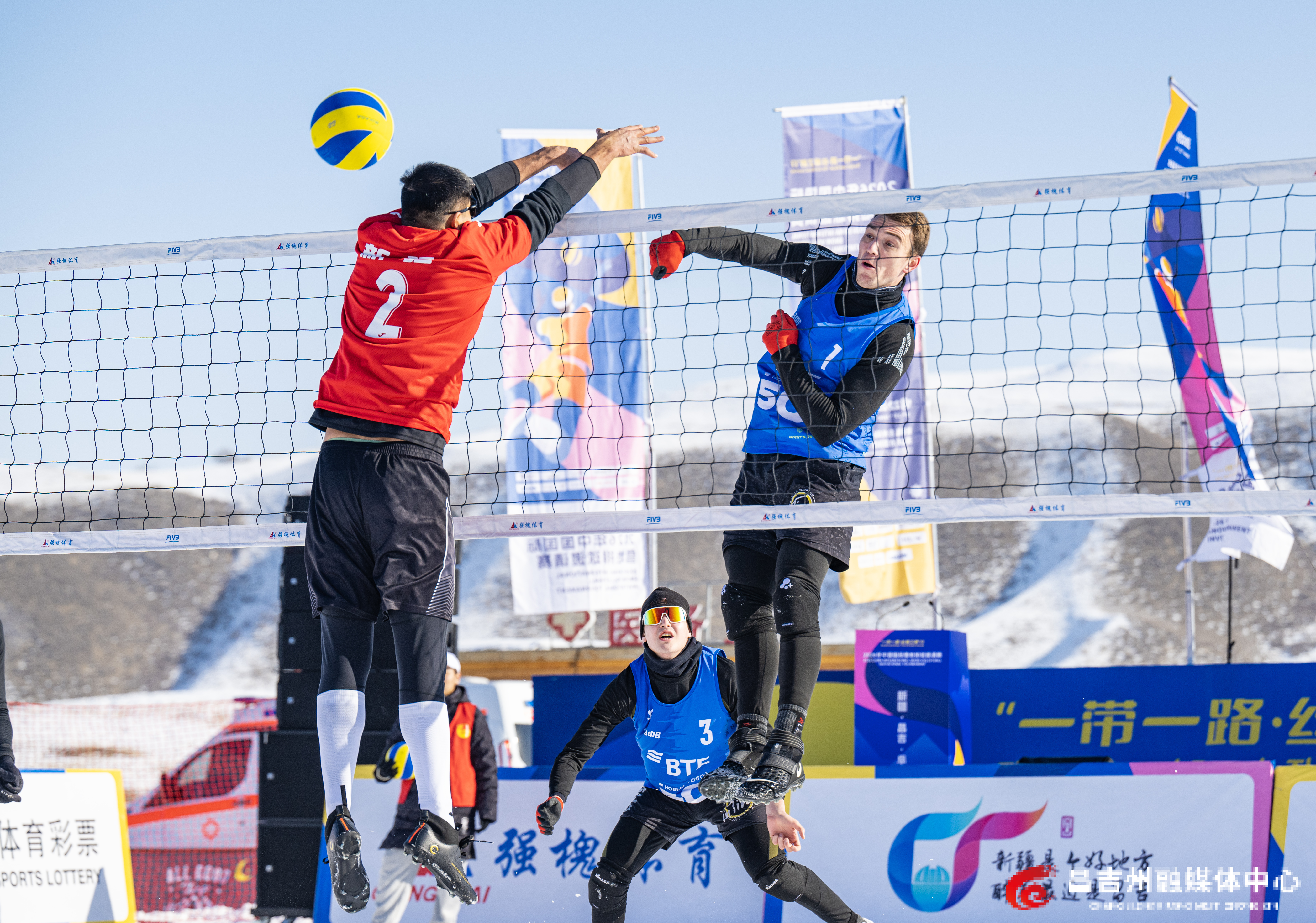 1月22日,阜康市天山天池国际滑雪场,“一带一路·丝绸之路”行2026年中国国际雪地排球邀请赛比赛现场,中国新疆男子一队和俄罗斯队进行比赛。