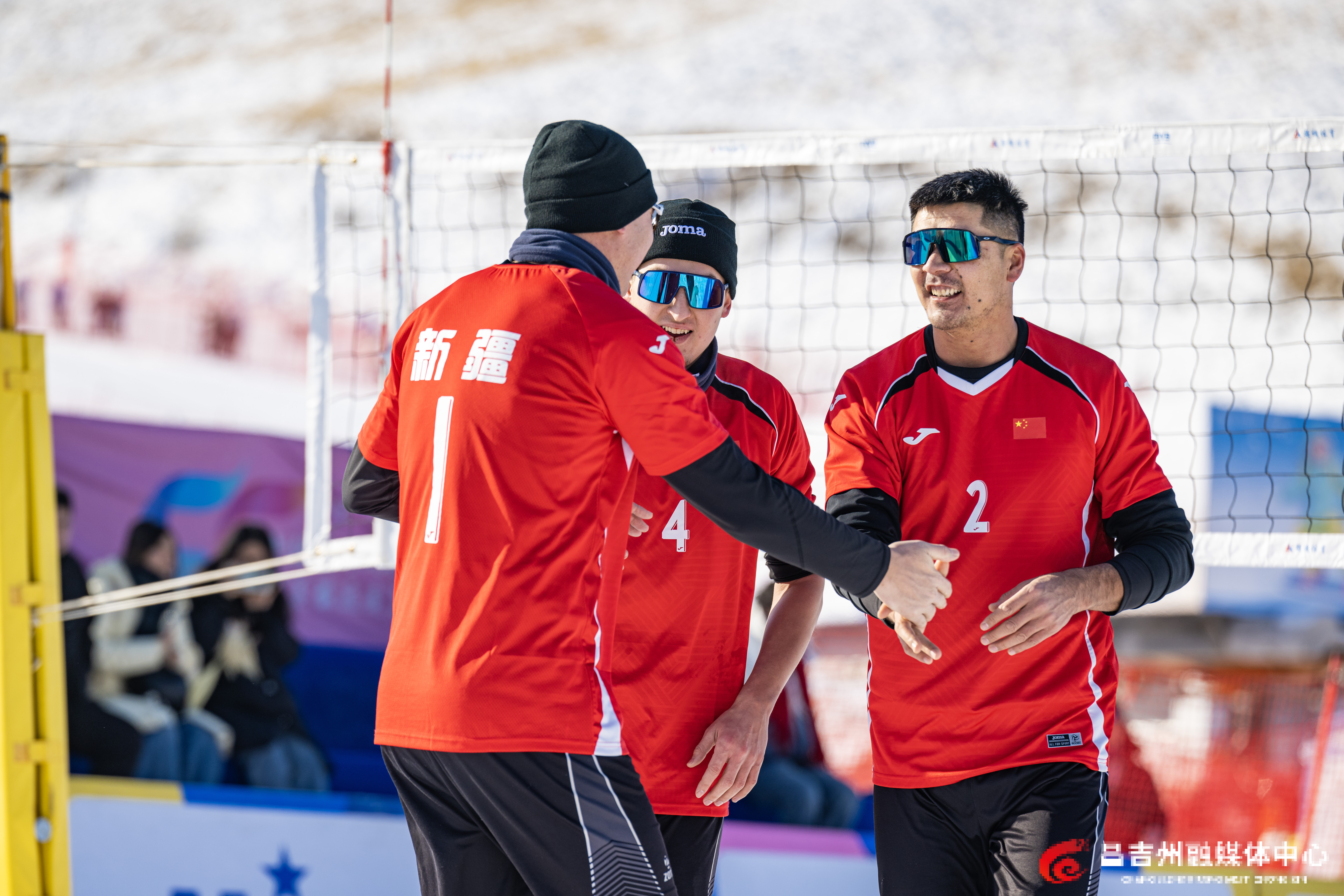 1月22日,阜康市天山天池国际滑雪场,“一带一路·丝绸之路”行2026年中国国际雪地排球邀请赛比赛现场,中国新疆男子一队球员庆祝得分。