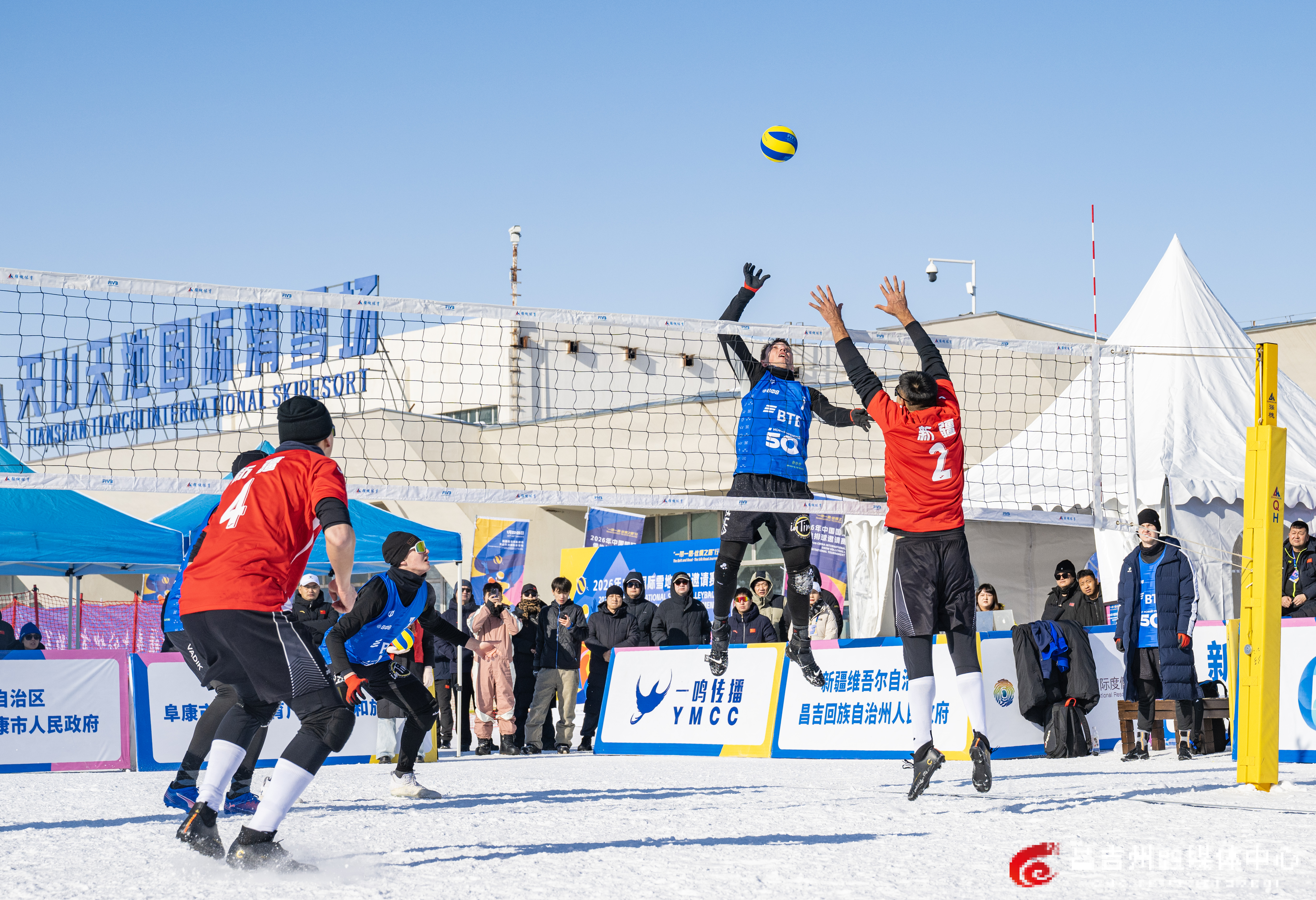 1月22日,阜康市天山天池国际滑雪场,“一带一路·丝绸之路”行2026年中国国际雪地排球邀请赛比赛现场。