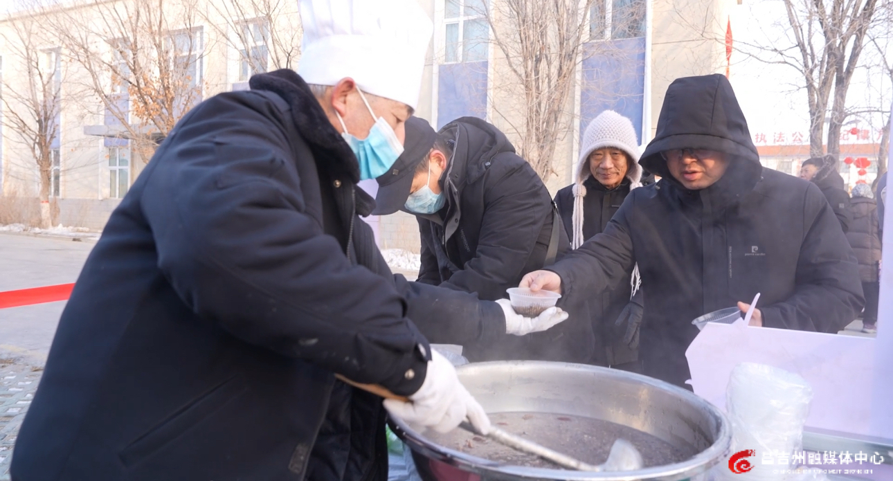 美食集市内热闹非凡,各类特色美食香气交织。最引人注目的要数六口热气腾腾的大锅。恰逢腊八节,在一口大锅里,美味的腊八粥咕嘟翻滚着,红枣、花生、红豆等十余种食材在文火慢炖中交融出醇厚的甜香。在另一口铁锅旁,师傅正挥舞着大铲翻炒大盘鸡,土豆与鸡块在红油里滋滋作响,浓郁的香辣味扑面而来。大锅鱼、炒米粉也争相出炉,鱼肉在汤汁里微微颤动,米粉在猛火快炒中裹满鲜亮的酱汁……烟火气与食物的香气交织在一起。师傅们一边颠锅、翻炒,一边笑着吆喝:“免费吃美食,带走好福气!”