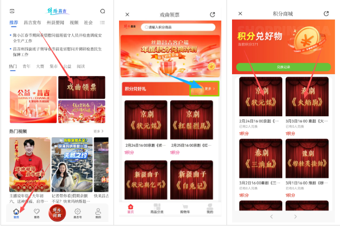 打开“丝路昌吉”客户端进入“首页”→在热门区点击“戏曲领票”专区进入领票页面→点击右上角“更多”查看所有场次→点击要看的场次,凭1积分兑换电子票。
