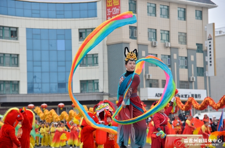 木垒县大南沟乡的各族群众身披节日盛装,将传统舞龙与民族舞蹈、民俗秧歌巧妙融合。