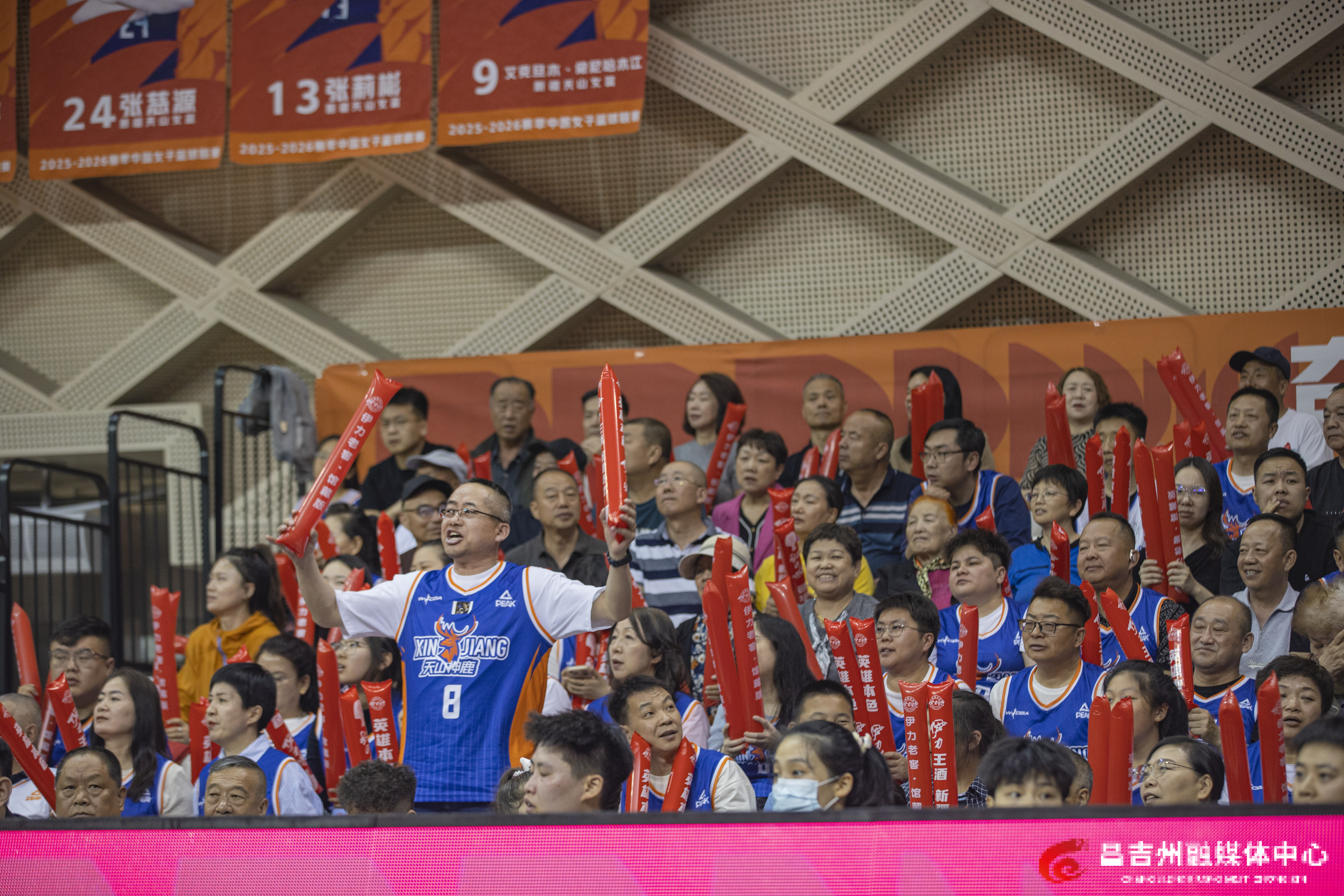 4月8日,昌吉体育馆,现场球迷为新疆天山女篮球员加油助威。