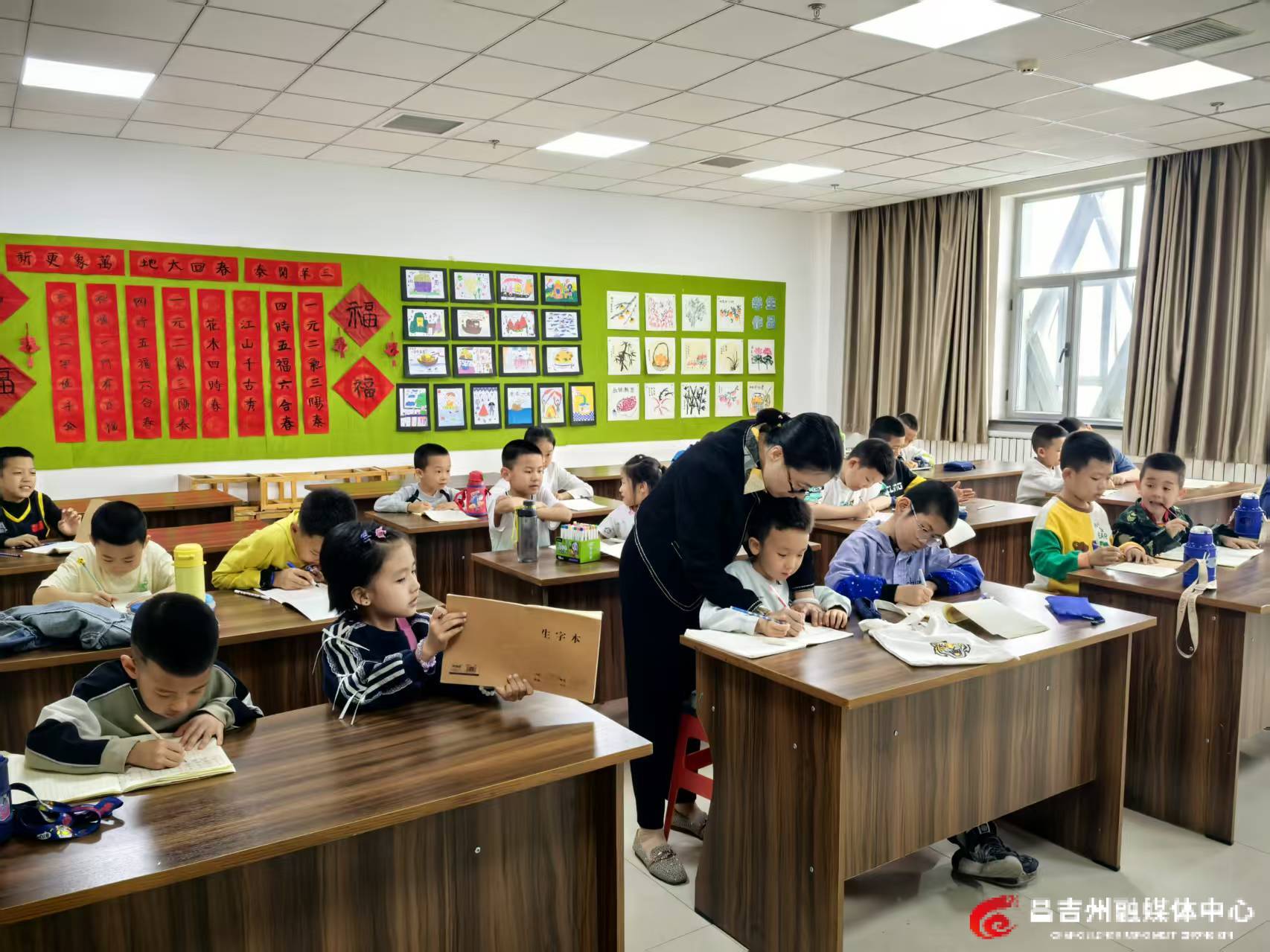 4月11日,少儿硬笔书法班课堂上,书法老师正一对一为孩子们进行书写指导。记者米桃乐 摄