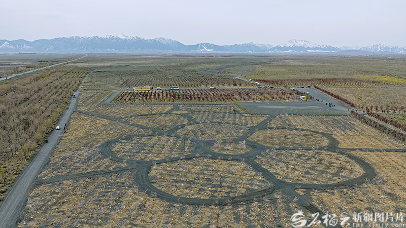 4月21日,俯瞰乌鲁木齐县乌板乌水公路两侧生态防护林建设工程现场。石榴云/新疆日报记者 周鹏摄