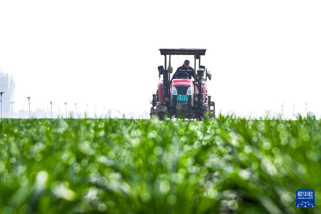 3月10日,河南省济源市轵城镇农民驾驶农机为小麦施肥。新华社发(苗秋闹摄)