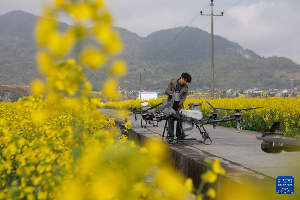 3月10日,在重庆市秀山土家族苗族自治县清溪场街道油菜种植基地,种植大户在给无人机安装电池,准备开展“一喷多促”田管作业。新华社发(胡程摄)