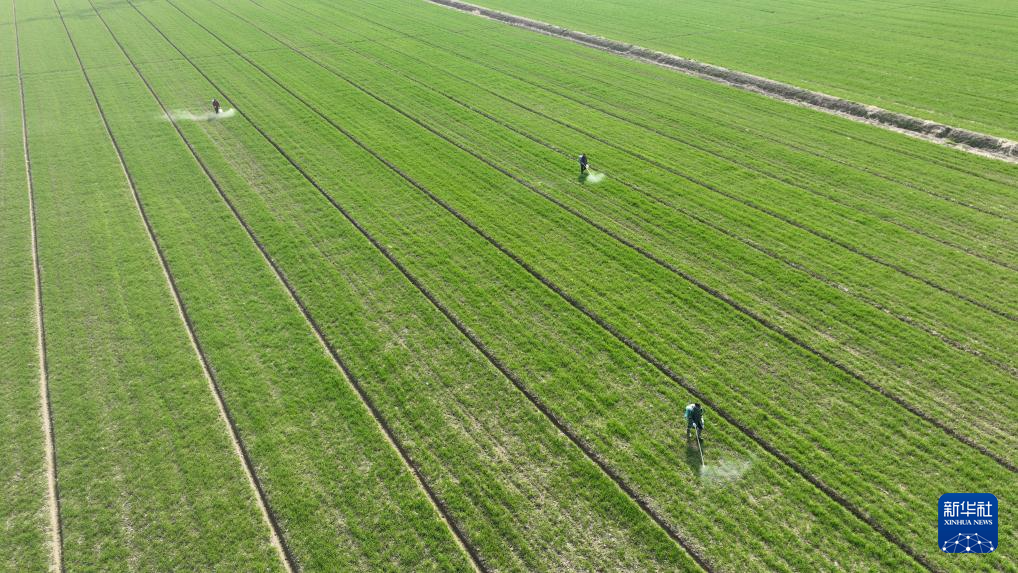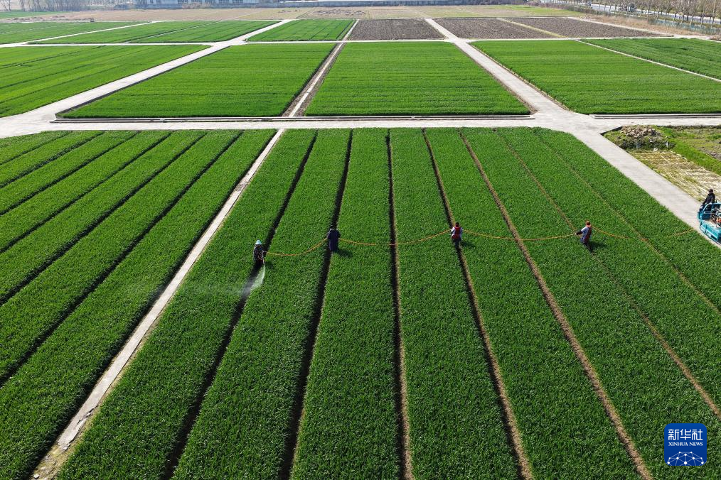 3月10日,在江苏省淮安市洪泽区三河镇,农民对小麦开展田管作业(无人机照片)。新华社发(万震摄)