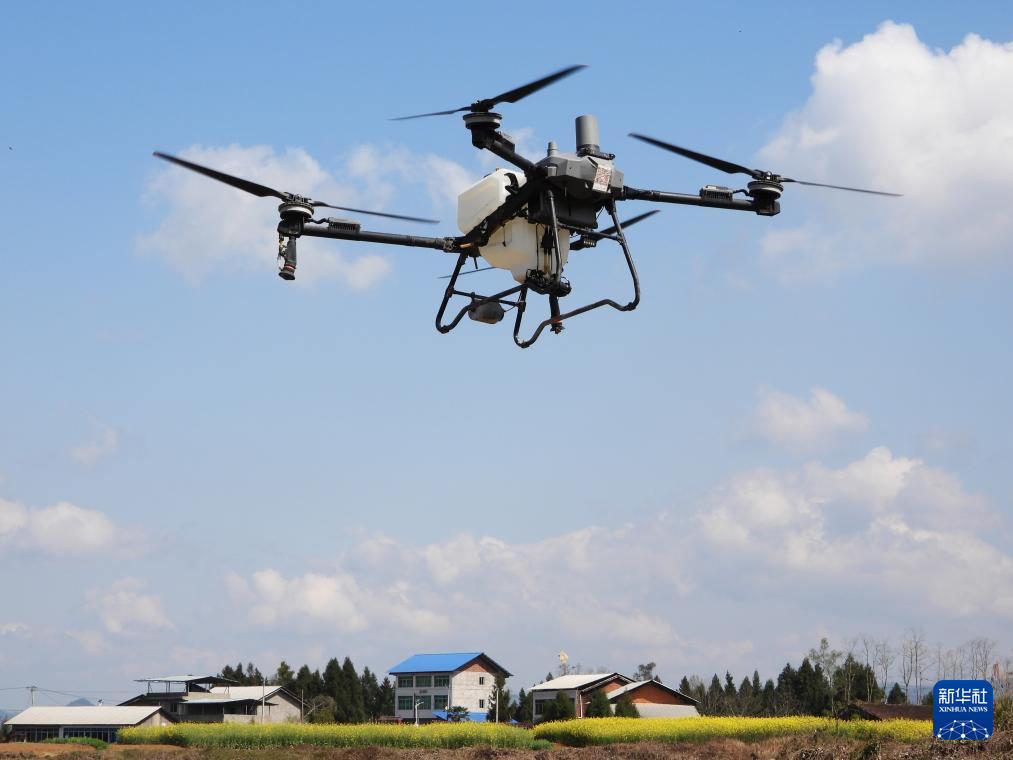 3月10日,植保无人机在四川省达州市渠县文崇镇谭坝社区6组进行喷洒作业。新华社发(邓良奎摄)