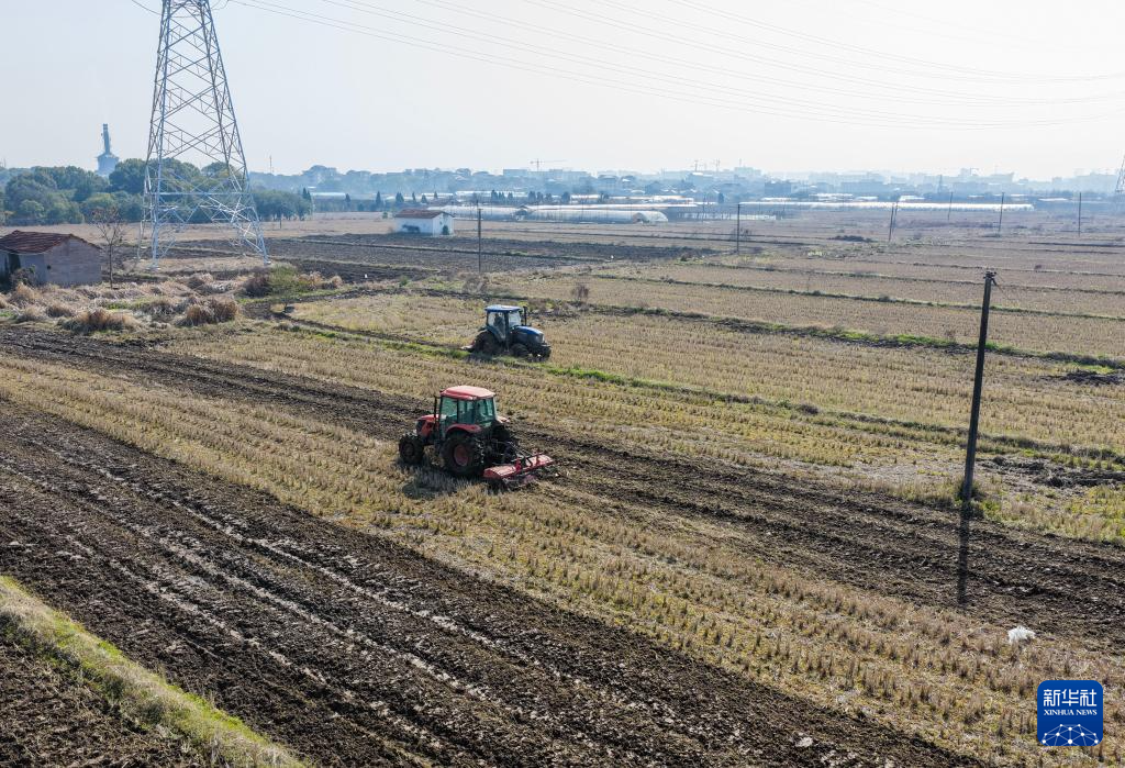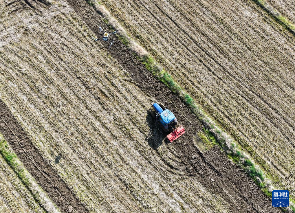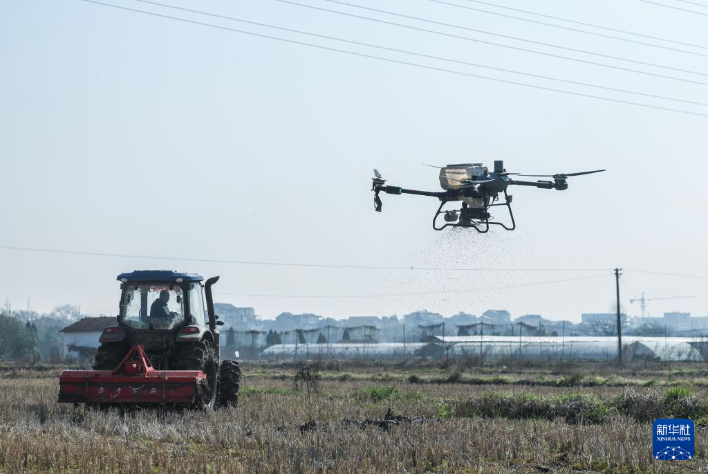 3月11日,在浙江省金华市金东区曹宅镇莲塘潘村的农田里,旋耕机与农用无人机配合,进行翻耕和施肥(无人机照片)。新华社记者 徐昱 摄
