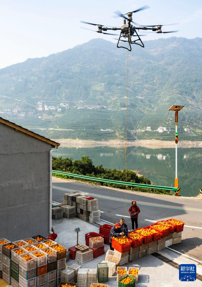 3月10日,技术人员在湖北省秭归县归州镇彭家坡村用无人机转运果农收获的脐橙。新华社发(郑家裕摄)