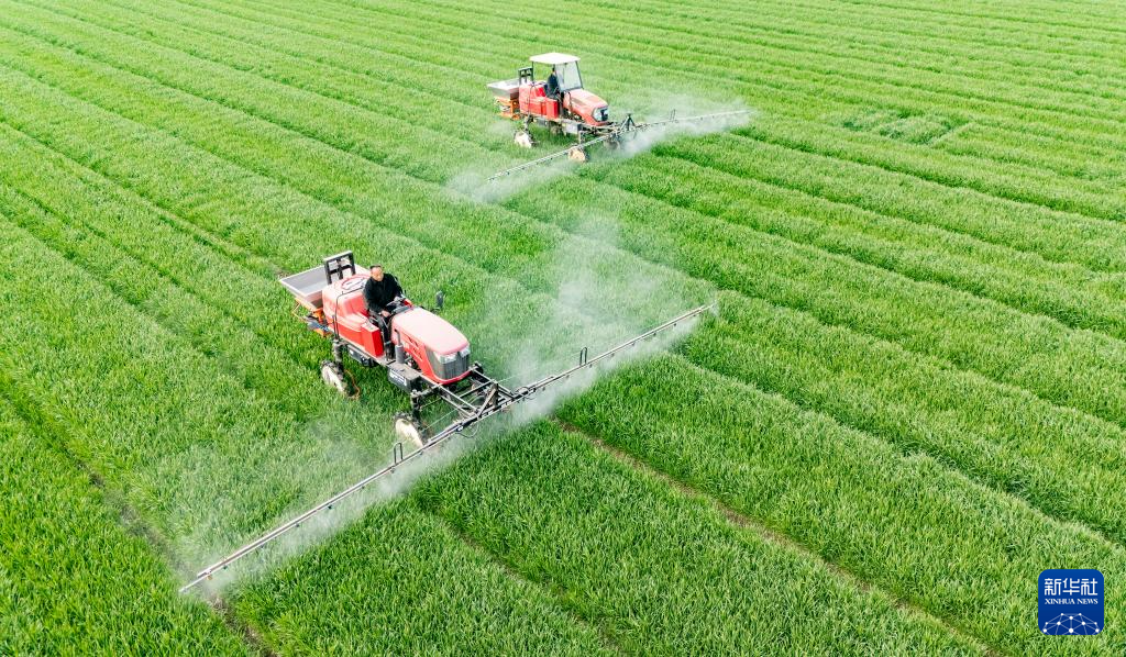 3月11日,在江苏省南通市通州区十总镇育民村,农民驾驶植保机对小麦开展田管作业(无人机照片)。新华社发(翟慧勇摄)