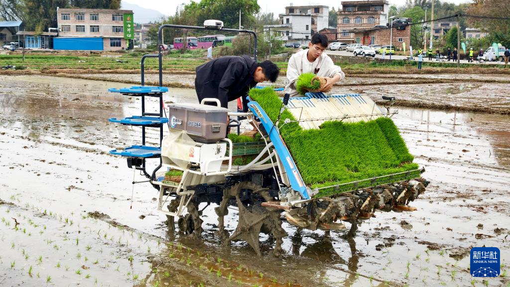 3月25日,广西贺州市八步区莲塘镇美仪村农技人员给插秧机装载秧苗。新华社发(廖祖平摄)