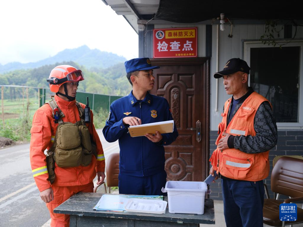 3月29日,消防救援人员(左、中)在都江堰林区入口进行防火检查。新华社发(程雪力摄)