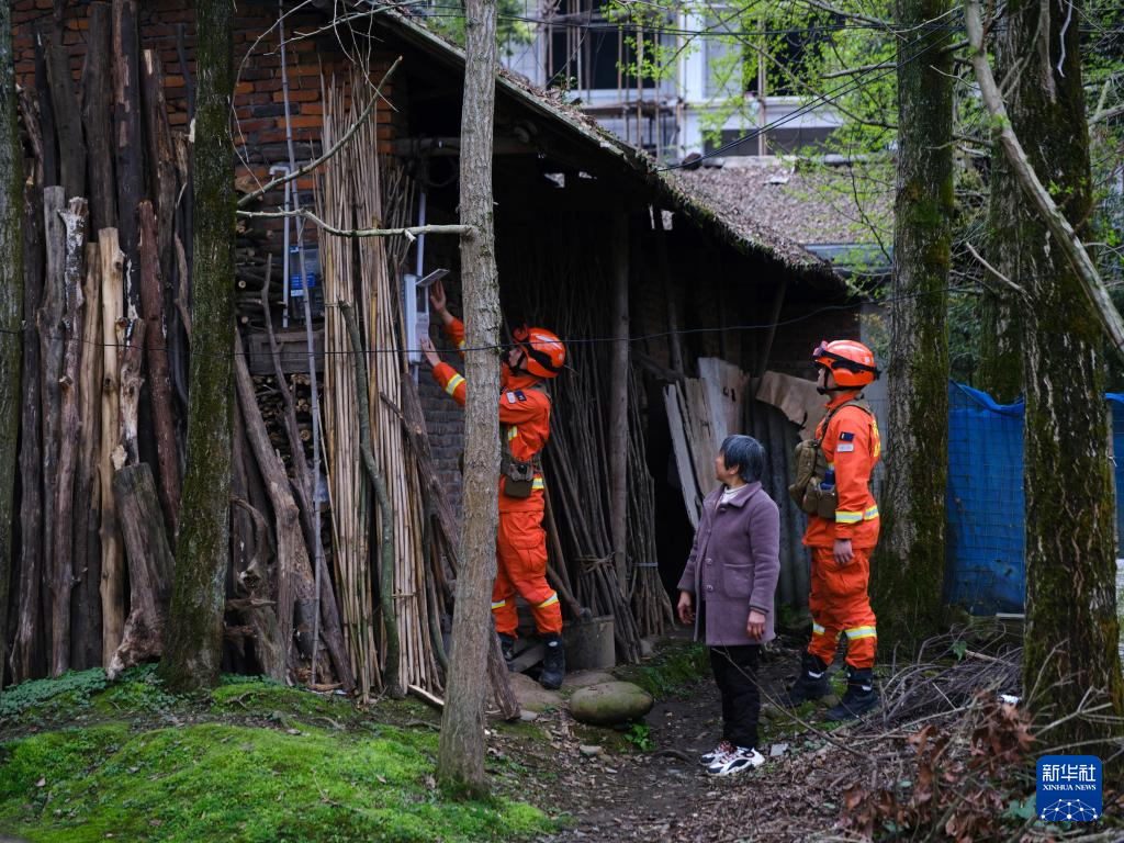 3月29日,消防救援人员在都江堰林区督导检查林区周边住户用电用火安全。新华社发(程雪力摄)