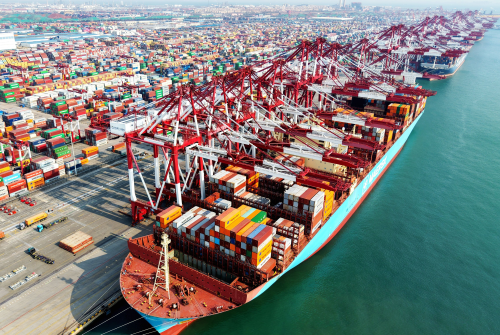 2026年3月10日,在山东港口青岛港,外贸集装箱码头作业一派繁忙(无人机照片)。新华社发(俞方平 摄)