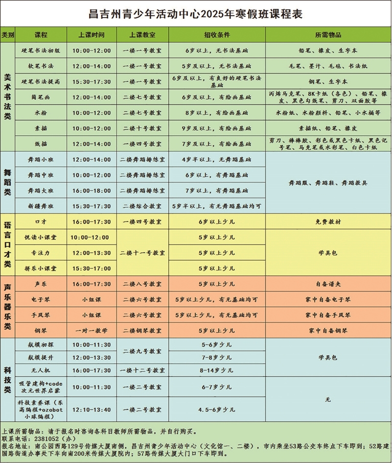 寒假期间,昌吉州青少年活动中心精心策划丰富多彩的课程。2025年寒假班定于1月10日开课,1月23日结束(周六上课,周日休息,如遇特殊情况无法上课将顺延),共12次课程。