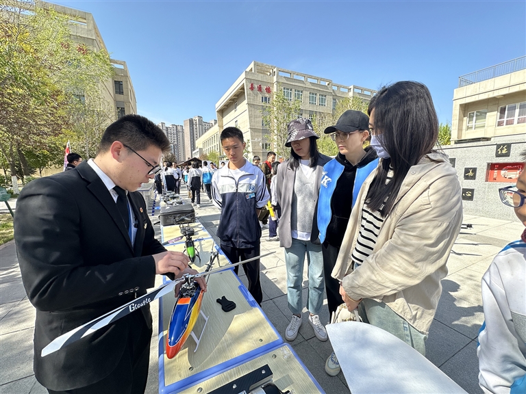 五月七日,昌吉市第九中学举办首届科技文化艺术节,学生正在介绍航模。 记者 王 硕摄