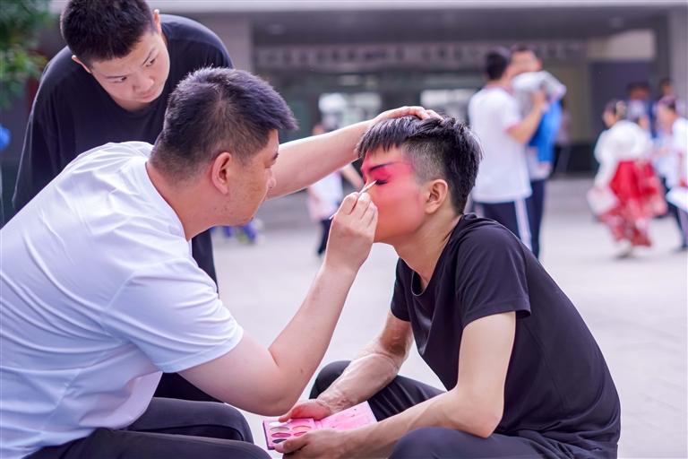 5月17日,在昌吉市第一中学,学生体验京剧化妆。 □杨 斌摄