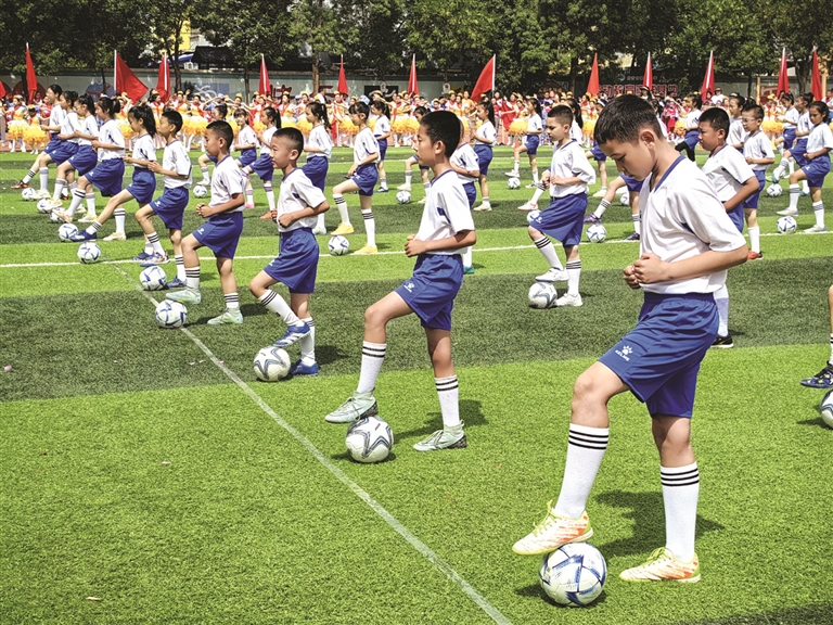 5月29日,昌吉市第十小学“人和杯”文化艺术节暨第41届田径运动会开幕式上,学生正在进行足球操表演。记者 荷苒·马汗摄