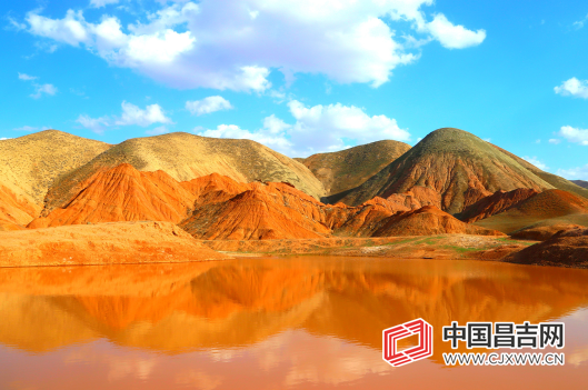 近日,在阜康市南部山区水磨河河畔的小红沟,春日暖阳里的山地丘陵呈现出深浅不一、五彩斑斓的色带,刚长出的小草又给这片多彩的山峦增添了片片新绿,在蓝天白云下更显美丽。鸟儿在空中自由飞翔,湛蓝的天空、大朵大朵的白云,水中倒映着山的影子,犹如一幅幅精美的工笔画。