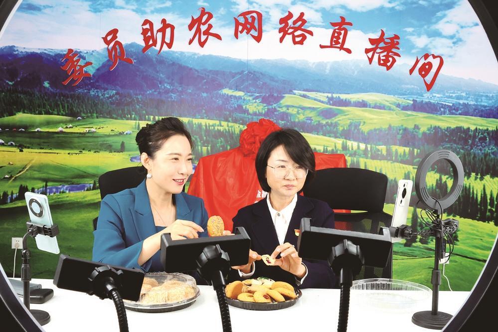 12月9日,昌吉市阿什里哈萨克族乡金涝坝村,政协委员在“委员助农网络直播间”化身“带货主播”与观众互动,为当地特色美食代言。昌吉市政协充分发挥政协委员视野宽阔、联系面广的优势,在金涝坝村建成昌吉市首个“委员助农网络直播间”,通过“互联网+”的销售模式,拓宽当地特色农副产品销售渠道,助推乡村产业发展,带动农民增收致富。 梁宏涛 摄