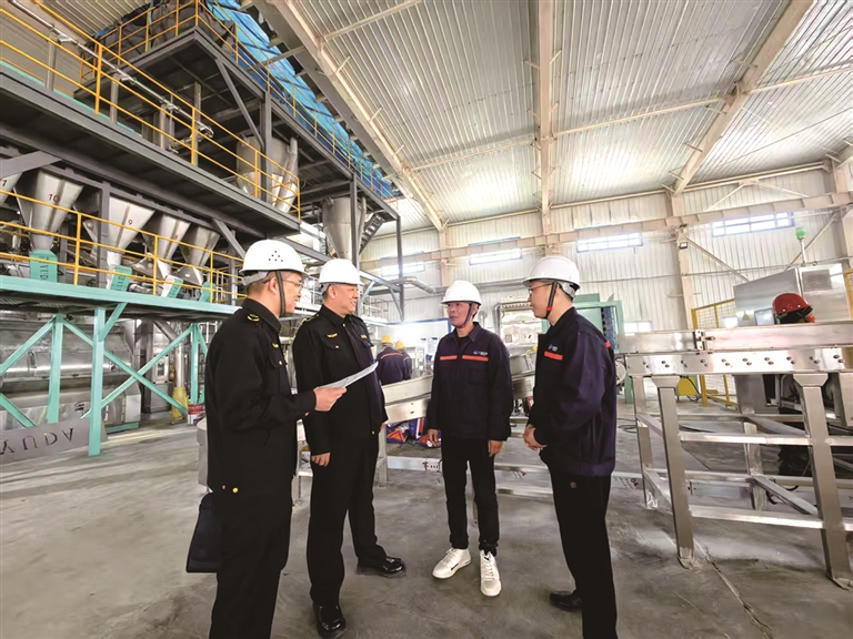 3月21日,新疆云图水溶肥有限公司生产车间,执法人员向企业负责人宣讲政策法规。记者 王 薇摄