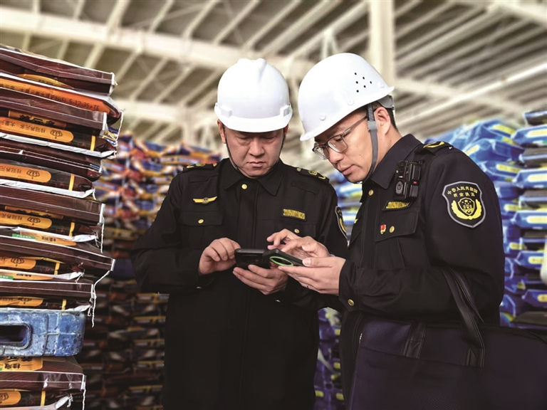 3月21日,新疆云图水溶肥有限公司成品车间,执法人员运用线上执法平台检查化肥产品登记证。记者 王 薇摄