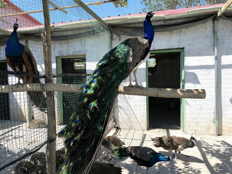 吉木萨尔县大有镇广泉下村村民丁培林2021年开始养殖蓝孔雀,现已养殖十几只。□巨佳辉摄