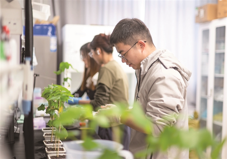 4月22日,昌吉国家农业高新技术产业示范区中国农业科学院西部农业研究中心,研究员在观察基因编辑棉花品种植株的长势。 昌吉国家农业高新技术产业示范区与中国农业科学院合作共建西部农业研究中心,目前,已有来自全国20多家研究所,100余个工作团队的技术专家前来进行科研工作,组建高品质棉花生产模式、作物生物安全与防控等16支创新团队,建设8个“高能级”科研平台,实施了一批国家重点研发项目,研发引进“中棉113”“宽早优”植棉技术等新品种、新技术,给新疆农业现代化插上科技的翅膀。 □中国昌吉网记者 何 龙摄
