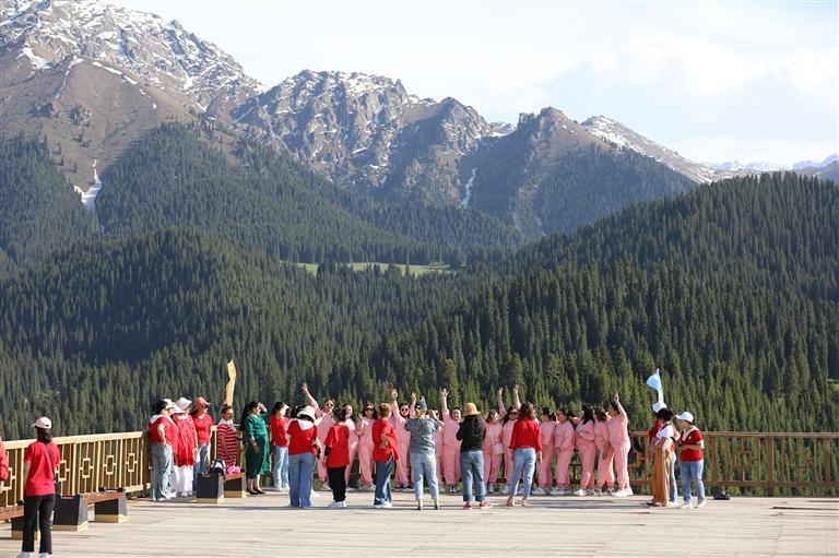 一杯金秋,半盏薄雾,通往天山天池的旅游公路呈现出油画般的迷人色彩。美丽的风光也滋养了能歌善舞的哈萨克族,伴着冬不拉的琴声,年轻的哈萨克族舞者跳着热情洋溢的舞蹈,歌手唱着迎接远方客人的歌谣。