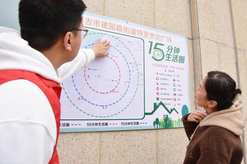 近日,昌吉市建国路街道丽景社区工作人员向新入住小区的居民介绍“15分钟生活圈”布局情况。霍延磊 摄