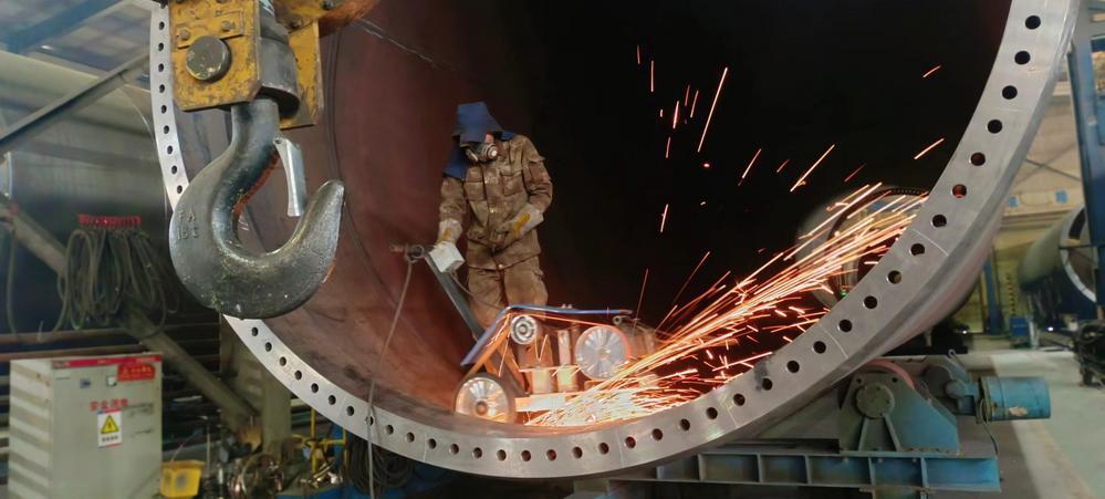 2023年12月14日,新疆骏晟能源装备有限公司制造车间,机械轰鸣、焊花飞溅,工人们加紧生产,一派火热繁忙景象。记者 王薇摄