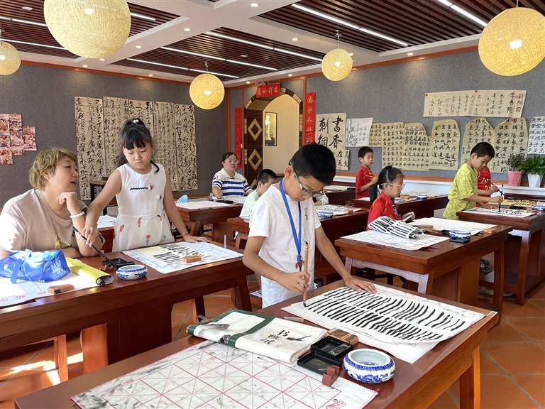 7月9日,昌吉市学生在刺桐国学书院学习书法课程。□殷雪娟摄