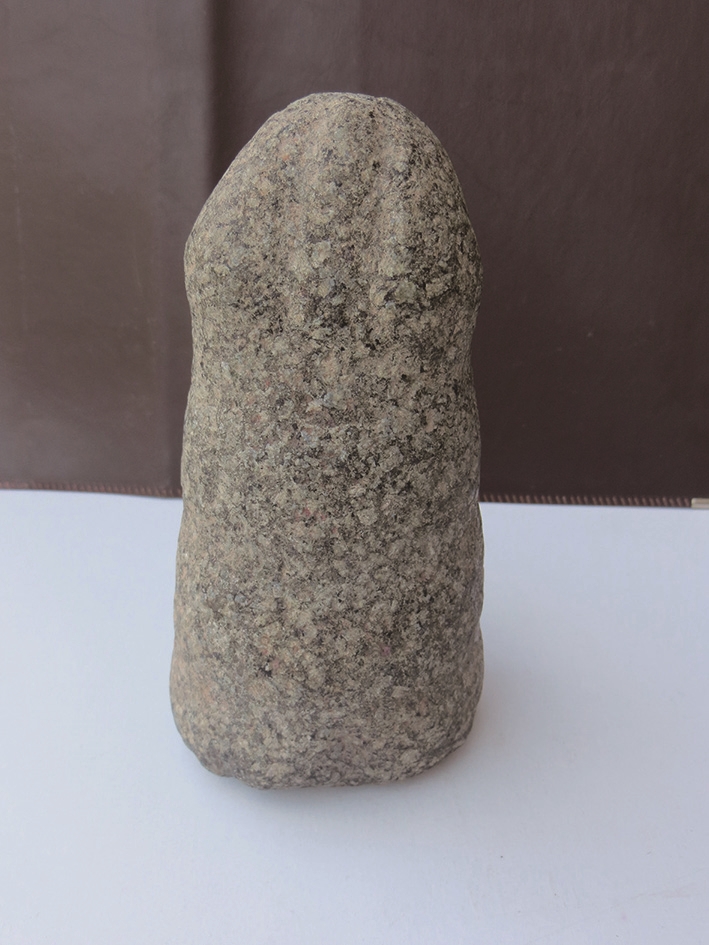 祖柄石杵整体略呈圆柱形,首端扁圆,首端一侧有不明显的两个沟槽略显颈部,柱体有三道不明显的凹陷,平底,磨制精巧。
