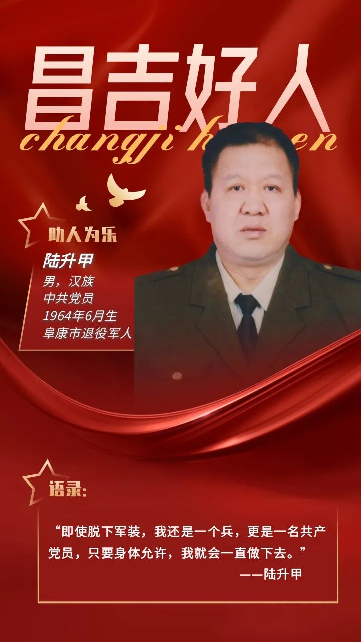 陆升甲1979年应征入伍。在部队服役期间,他始终牢记军人的职责使命,苦练业务技能,奉献自己的青春和汗水,在部队期间,陆升甲先后荣立三等功4次,曾多次被授予“优秀共产党员”“优秀基层带兵干部”“优秀机关干部”等荣誉称号。2004年6月,一场意外让他不得不提前退役,因工伤从部队病退后,他开始热衷于公益活动,参加义务献血,也加入了中国志愿者协会,积极参加各类志愿服务活动,默默地为公益事业尽自己的一份力。每年冬季在固定献血点,由于户外气温低,采血袋如在献血车上过夜就会被冻成冰块,导致无法使用,作为志愿者的陆升甲得知后,就蹬着三轮车,帮工作人员把装有采血袋的箱子搬运到宾馆,第二天一大早再拉回献血车上供采血使用。